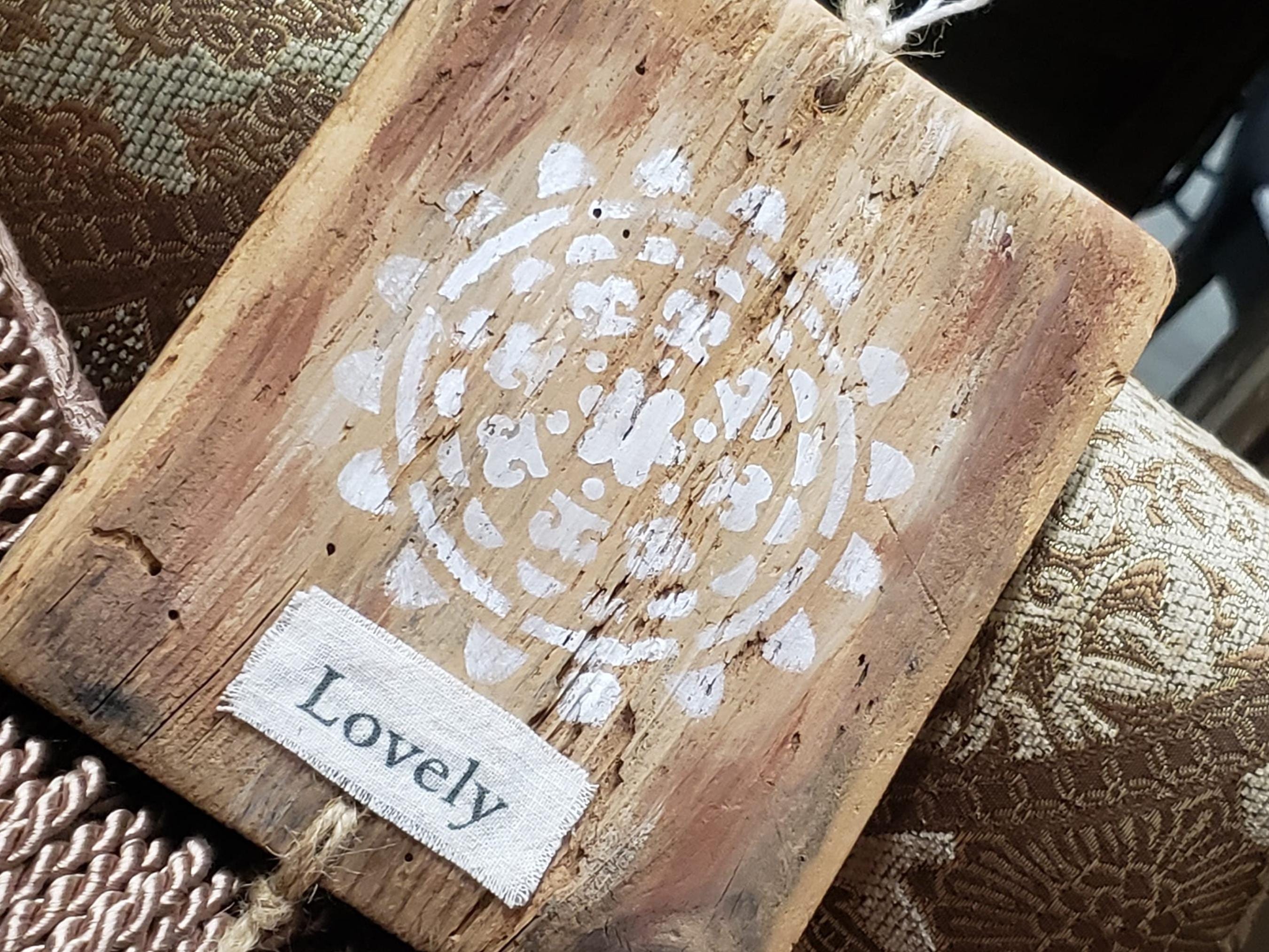 Accent your bohemian space with a hand painted white mandala stenciled on barnwood.