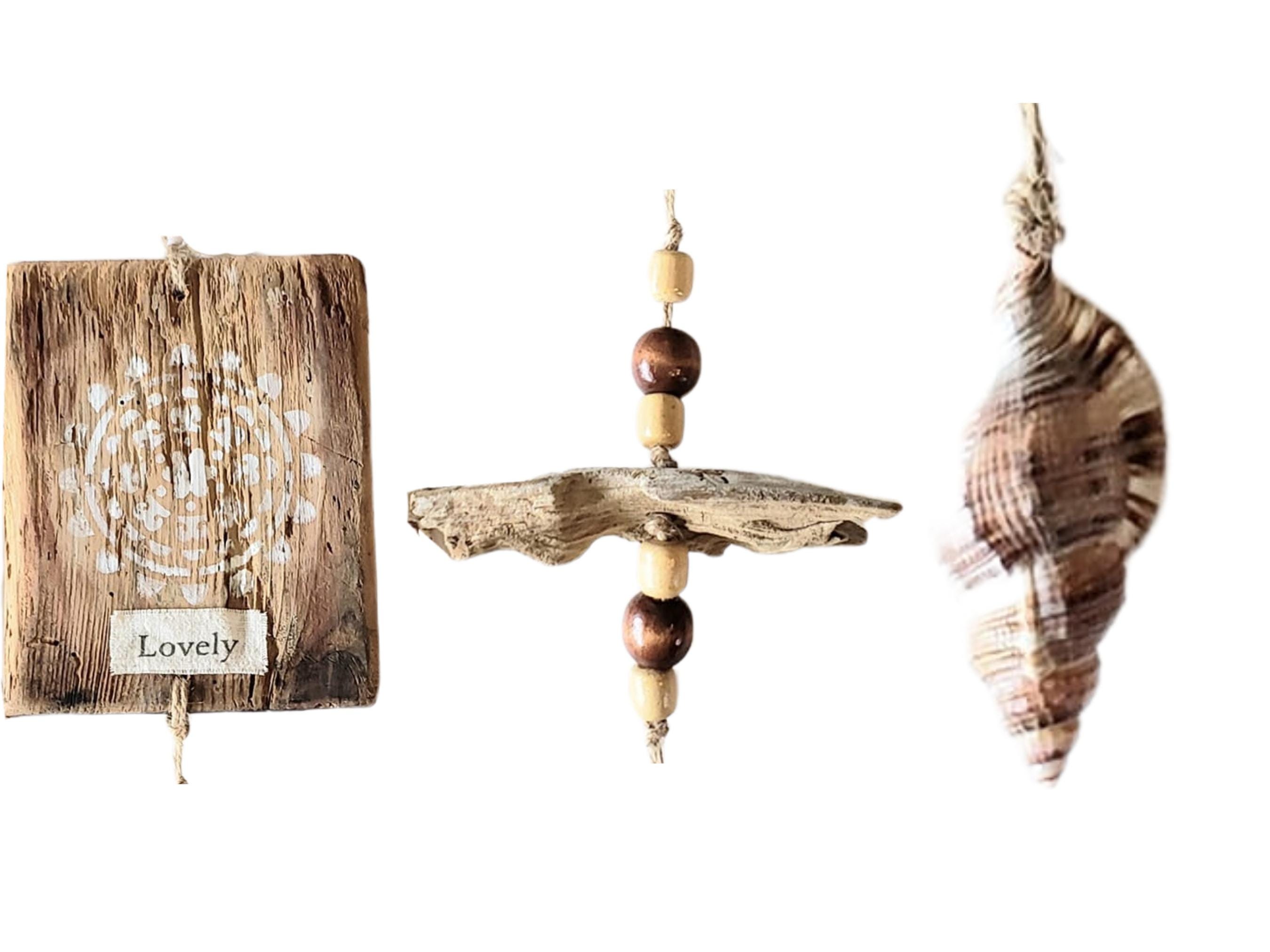 Trending is a long earthen beige wall hanging with North Carolina driftwood and glazed seashell on a preserved segment of 100+ year old barn wood. Salvaged, reclaimed barnwood from felled barns in Northern Indiana USA. Compliments of my father and his hard work in making sure this wood is claimed and repurposed from structures that can no longer stand. The driftwood and seashell I hand plucked from the brackish waters of coastal N. Carolina. Adding a touch of driftwood and wooden beads make for a long hanging front porch or living room accent.