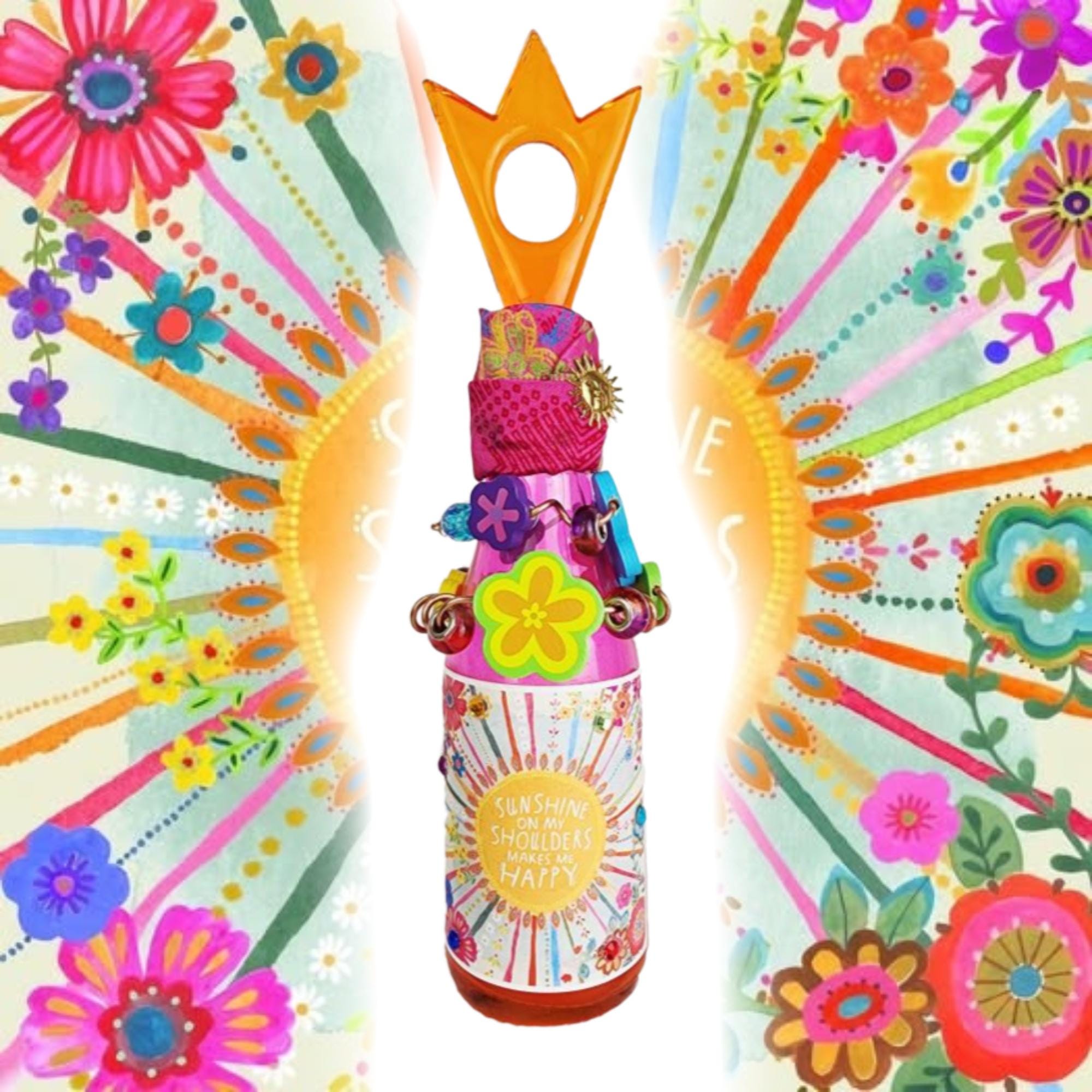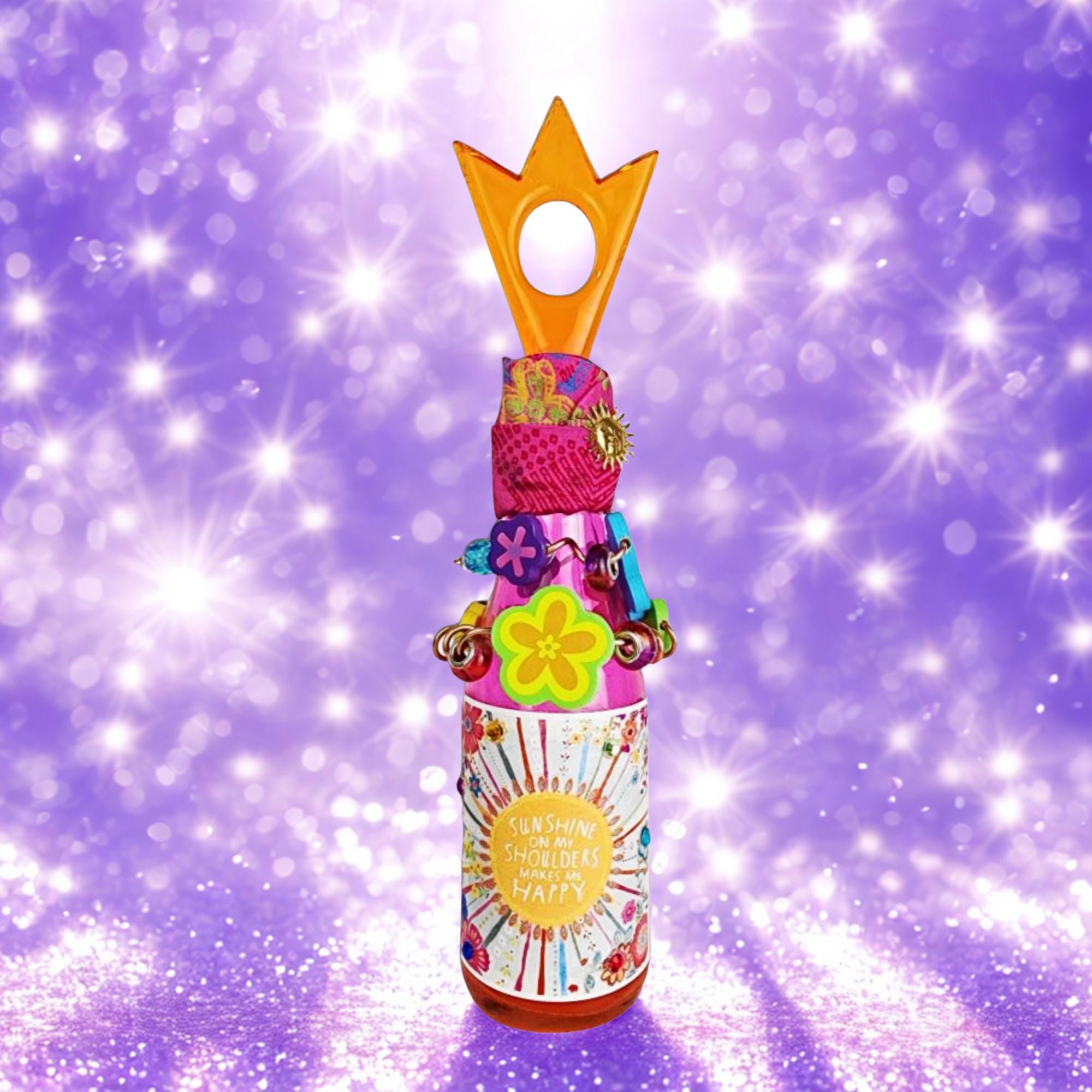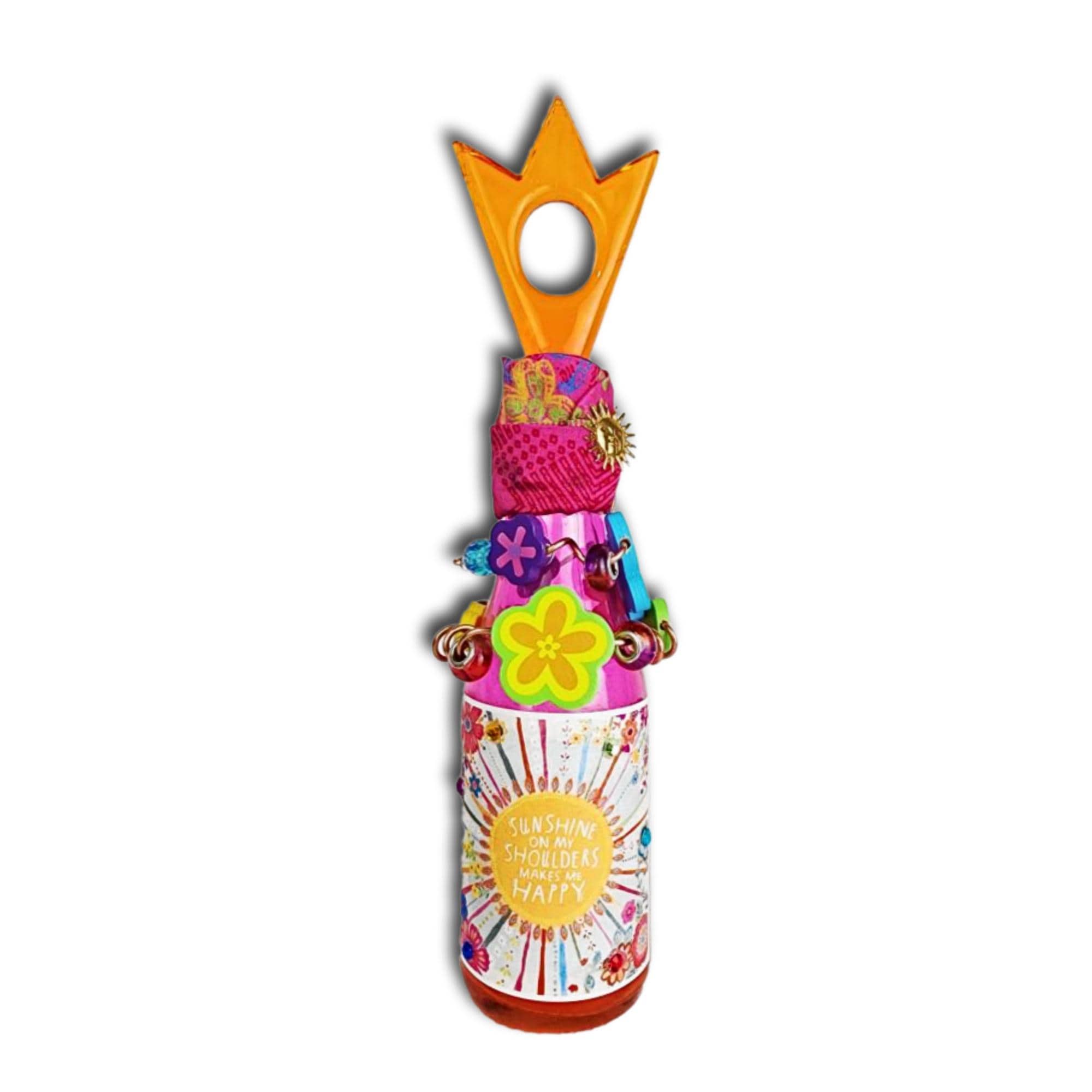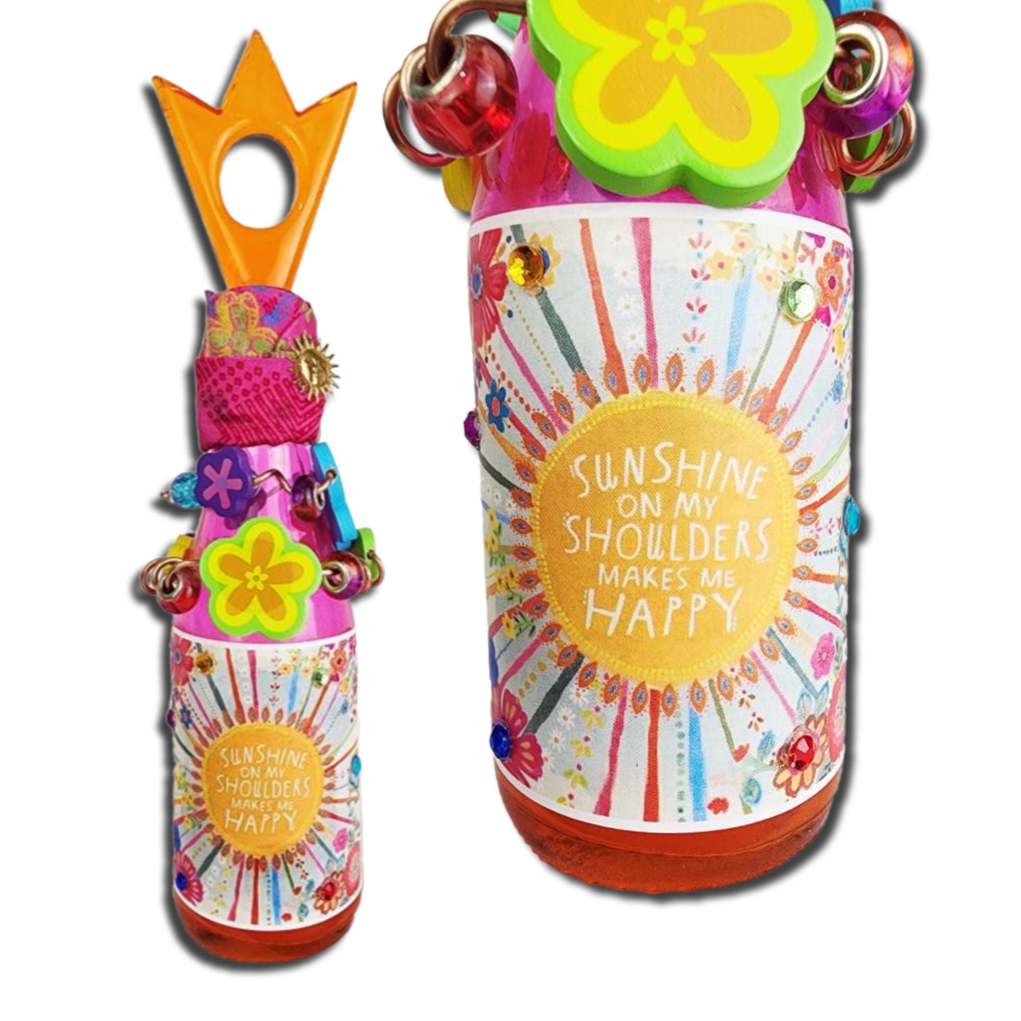 A whimsically vibrant and joyful decorative bottle bursting with color and positivity. The design features a playful mix of bright pink, orange, yellow, and blue hues, adorned with cheerful embellishments like flowers, beads, and charms. The front label reads “Sunshine on my shoulders makes me happy,” surrounded by a radiant burst of colorful lines and confetti-like details. The bottle’s neck is wrapped in textured fabric and topped with a bold orange crown-shaped handle, adding a whimsical, artistic flair. Perfect as a statement art piece or a gift that spreads happiness and sunshine wherever it’s displayed.