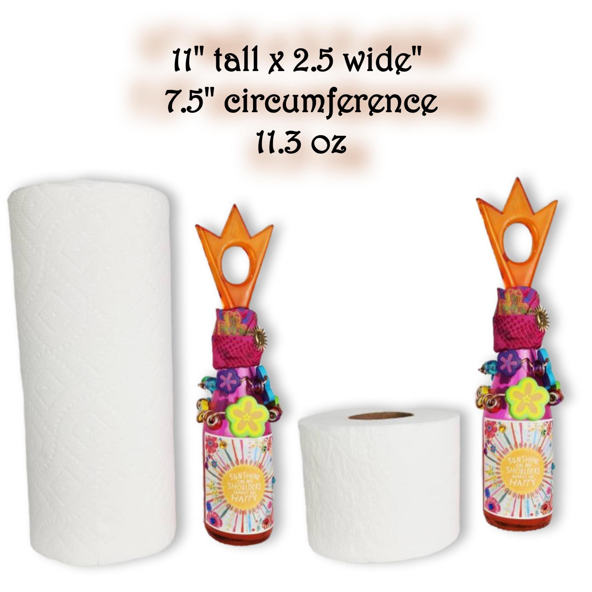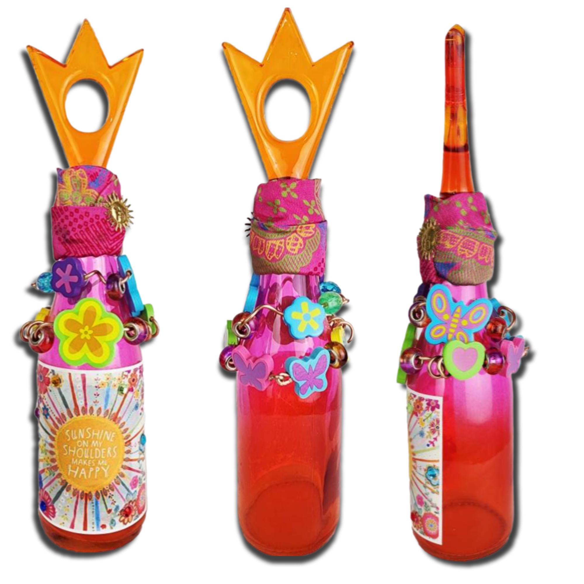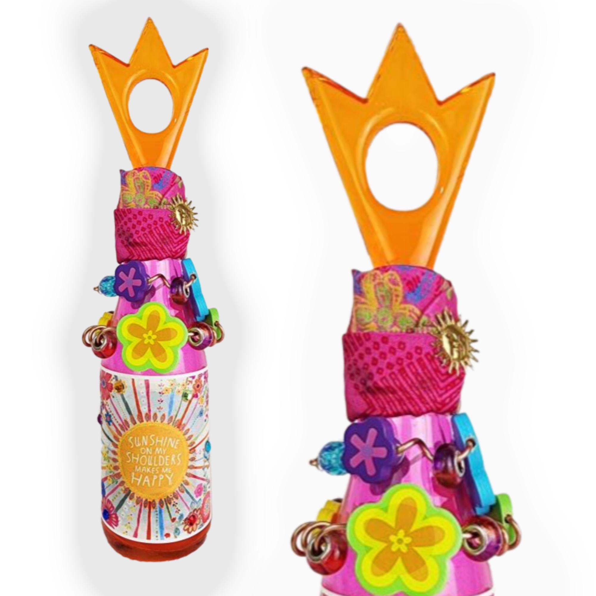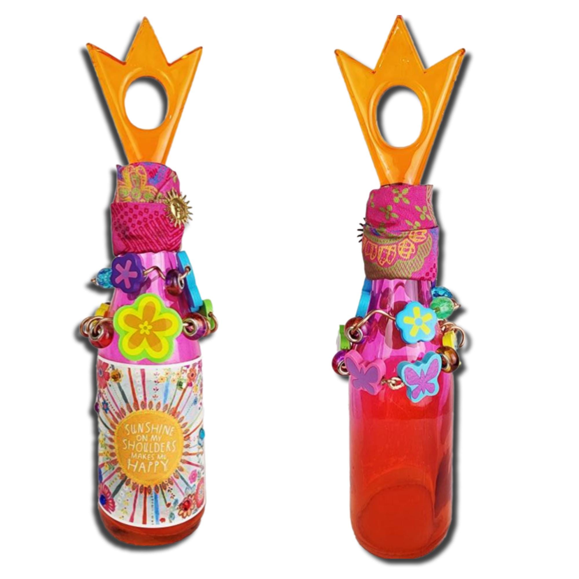 A whimsically vibrant and joyful decorative bottle bursting with color and positivity. The design features a playful mix of bright pink, orange, yellow, and blue hues, adorned with cheerful embellishments like flowers, beads, and charms. The front label reads “Sunshine on my shoulders makes me happy,” surrounded by a radiant burst of colorful lines and confetti-like details. The bottle’s neck is wrapped in textured fabric and topped with a bold orange crown-shaped handle, adding a whimsical, artistic flair. Perfect as a statement art piece or a gift that spreads happiness and sunshine wherever it’s displayed.