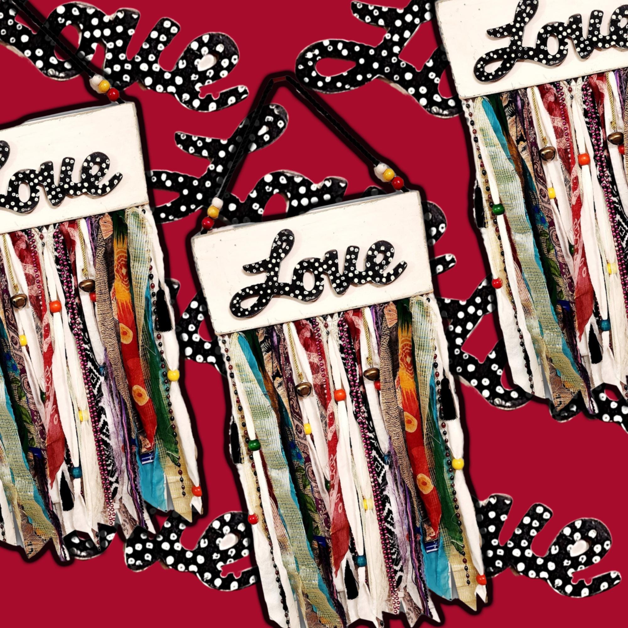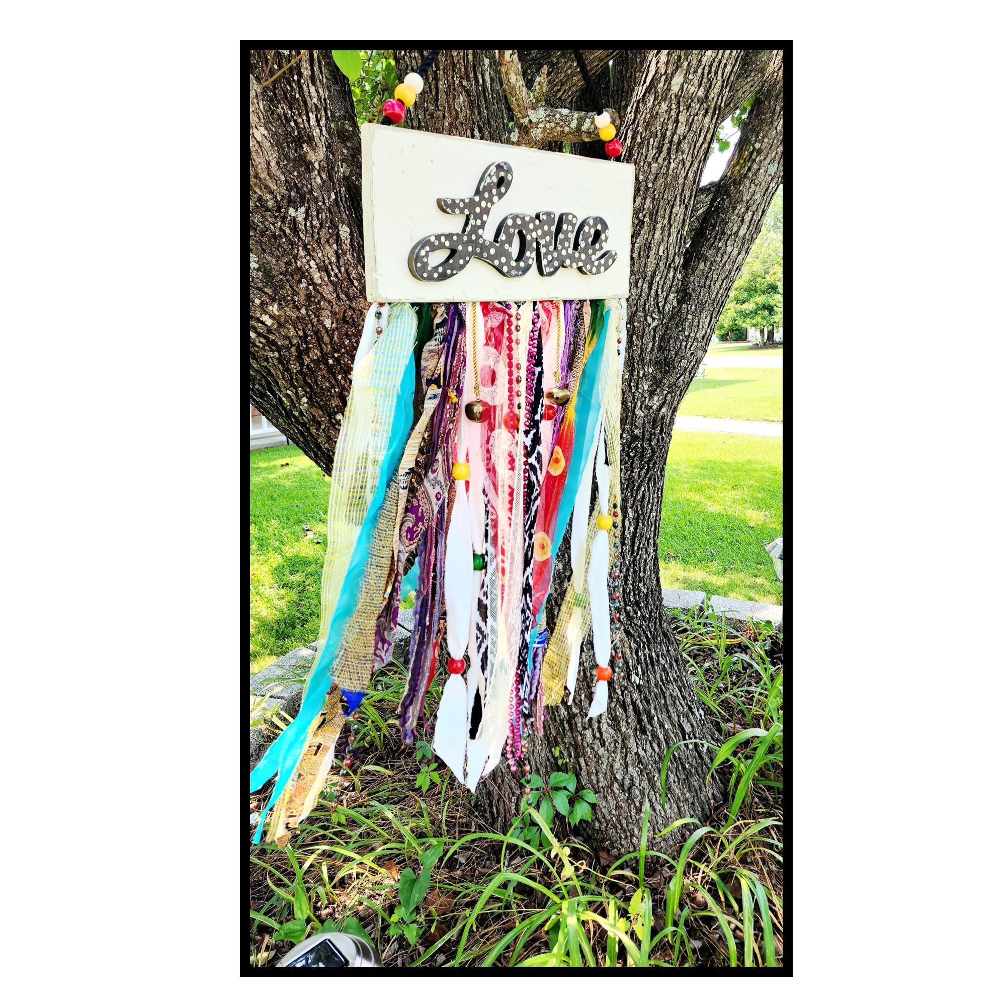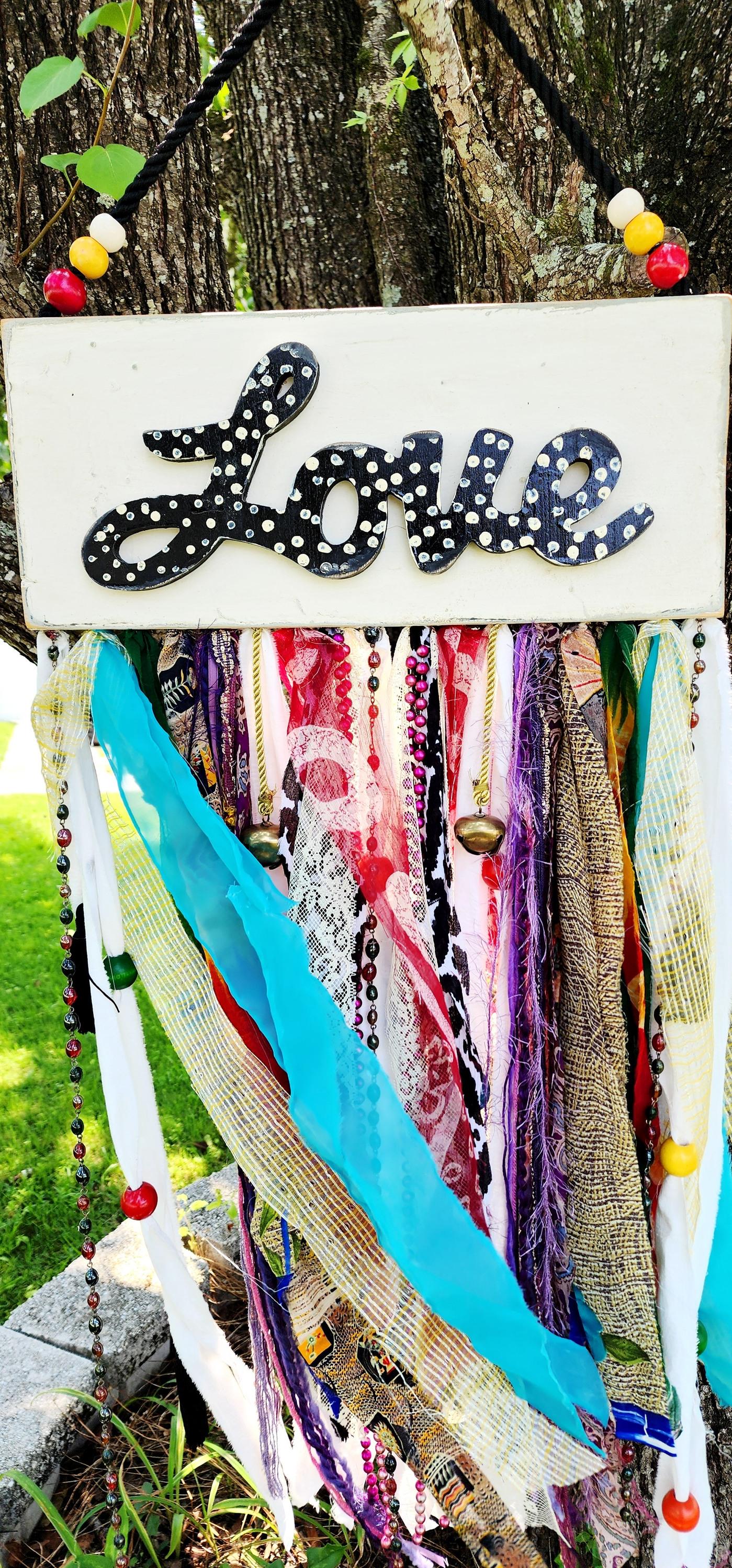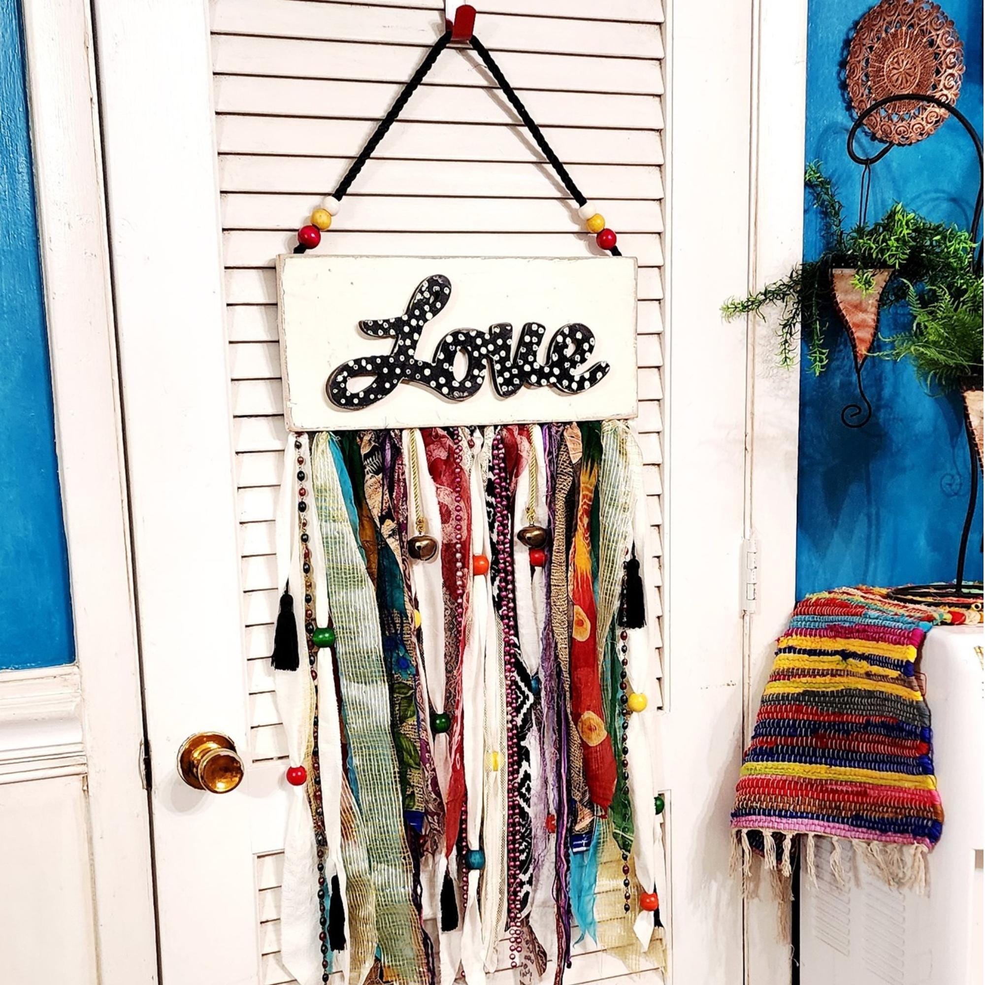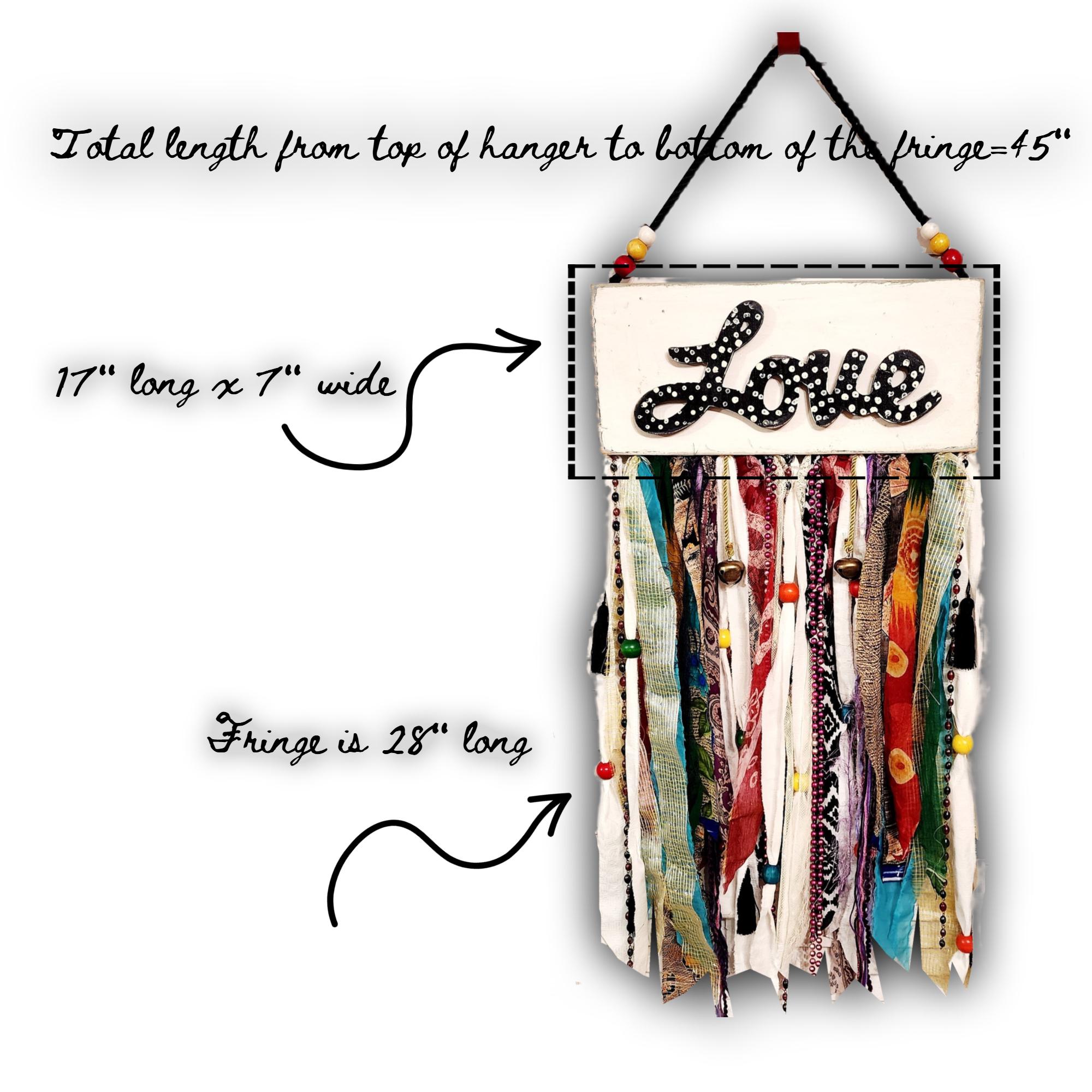 This boho hippie gypsy fringe wall hanging proclaims " LOVE". Flying in the breeze brings peace, as lovely fringes flow. Draped on your front porch or the trees out front, you can put this wall hanging on your fence or hippie camper. The fringe is thick and full. Not skimpy! The top portion of your wall hanging is from a recycled felled fence.