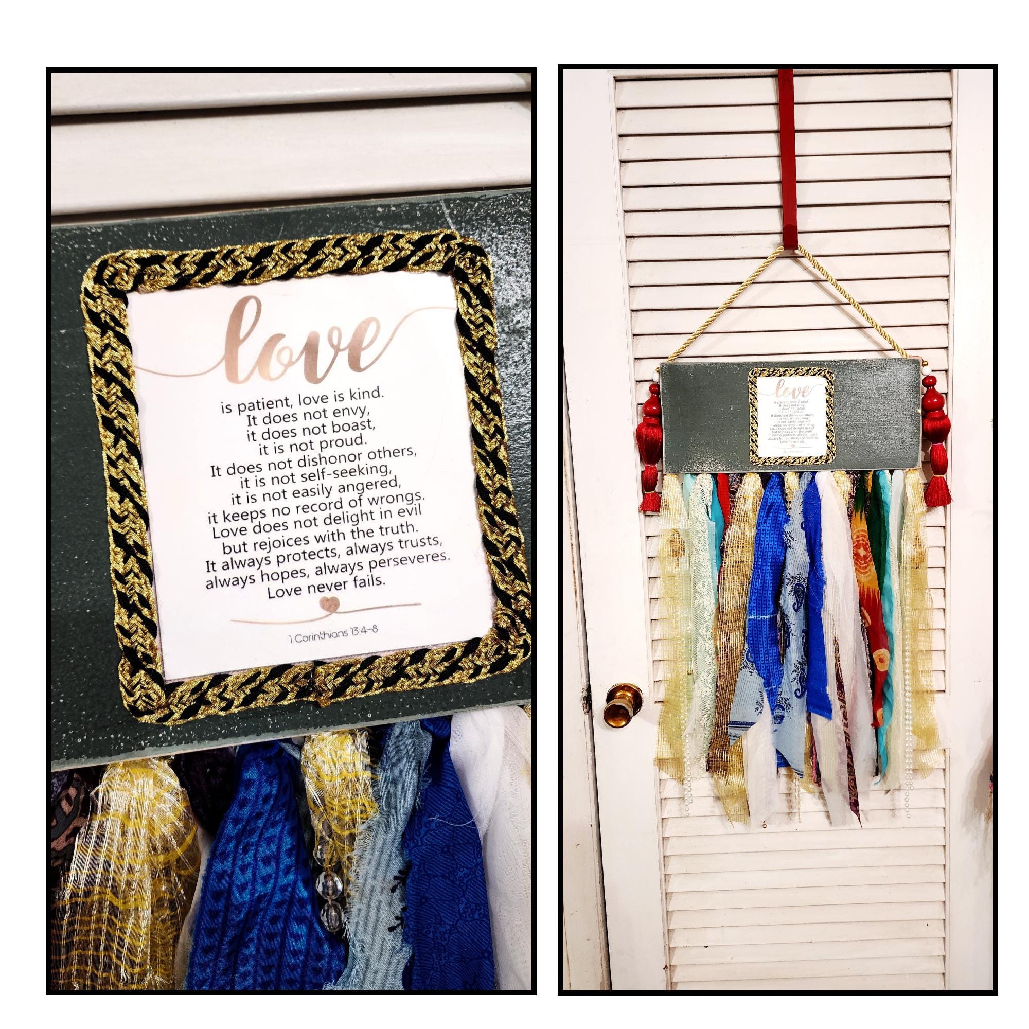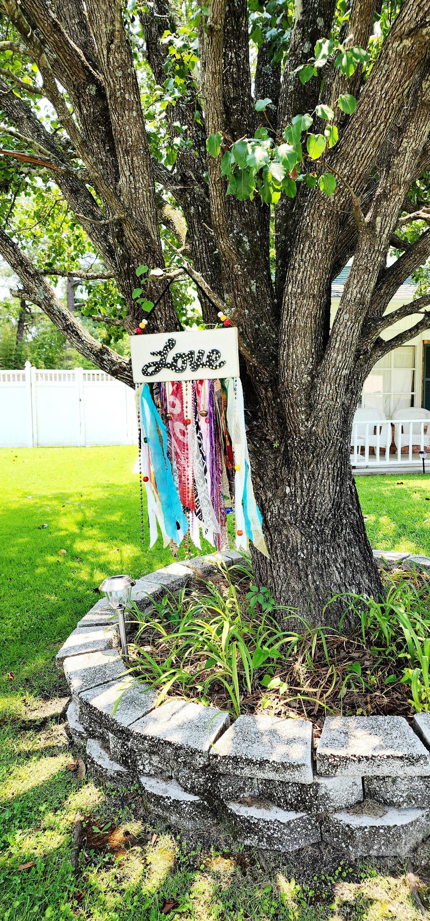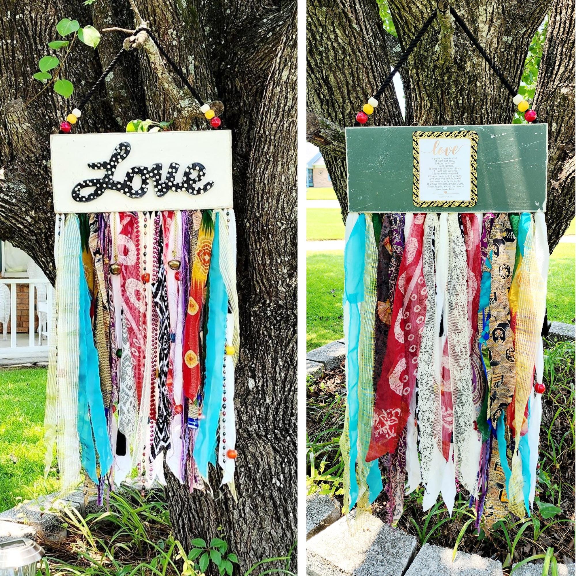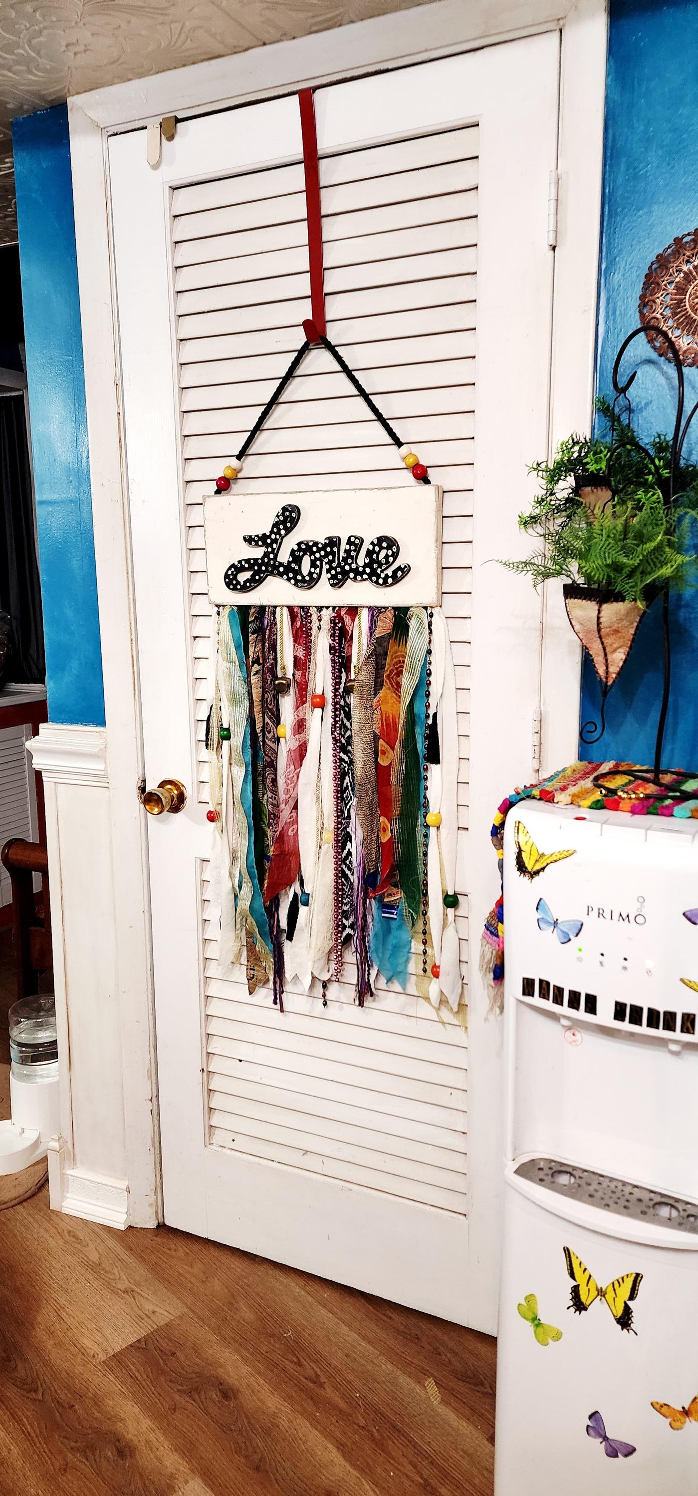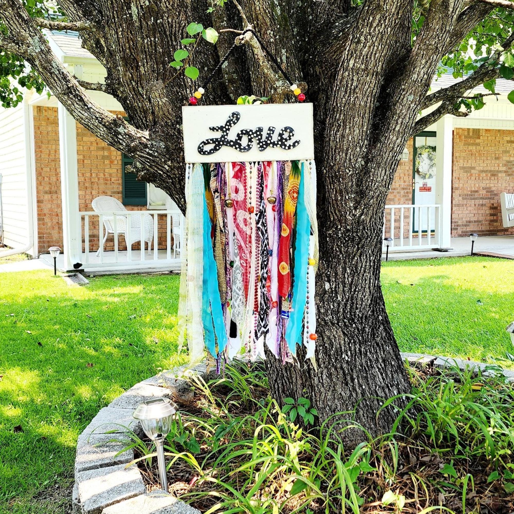 This boho hippie gypsy fringe wall hanging proclaims " LOVE". Flying in the breeze brings peace, as lovely fringes flow. Draped on your front porch or the trees out front, you can put this wall hanging on your fence or hippie camper. The fringe is thick and full. Not skimpy! The top portion of your wall hanging is from a recycled felled fence.