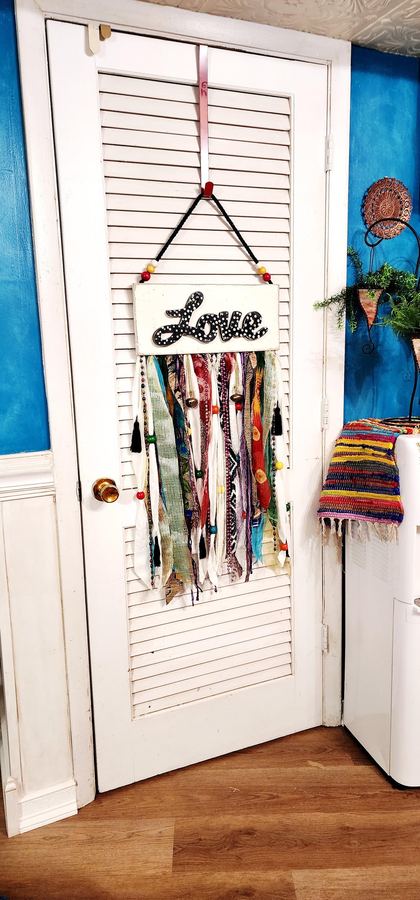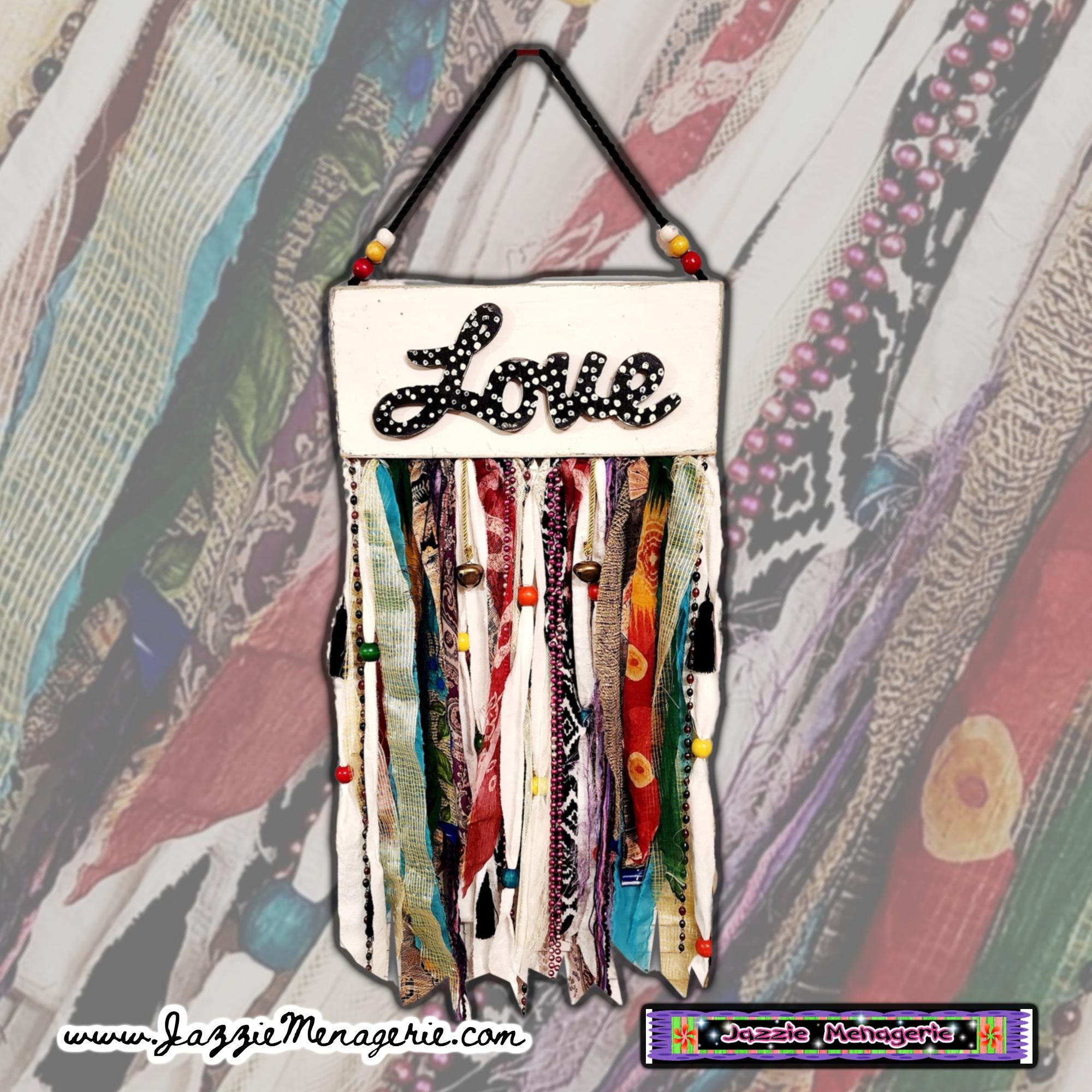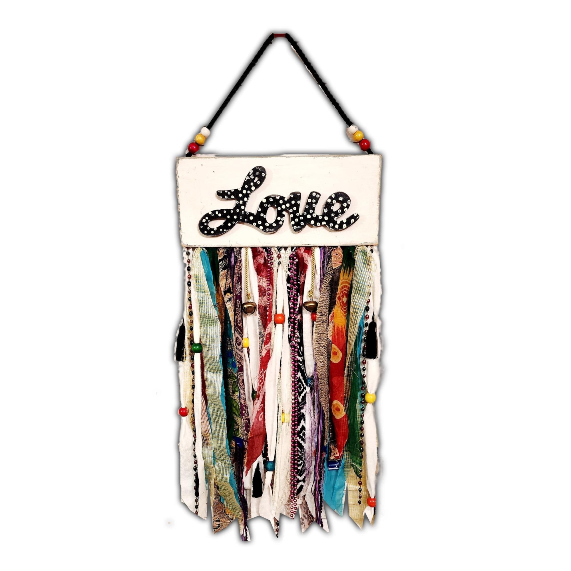 Accented with wooden beads, small bells, and playful details, this piece captures a joyful, handmade spirit. Suspended from a beaded hanging cord, it’s perfect for adding warmth and personality to any room. Ideal for bohemian, eclectic, or rustic decor, this wall hanging celebrates creativity, love, and artistic expression.