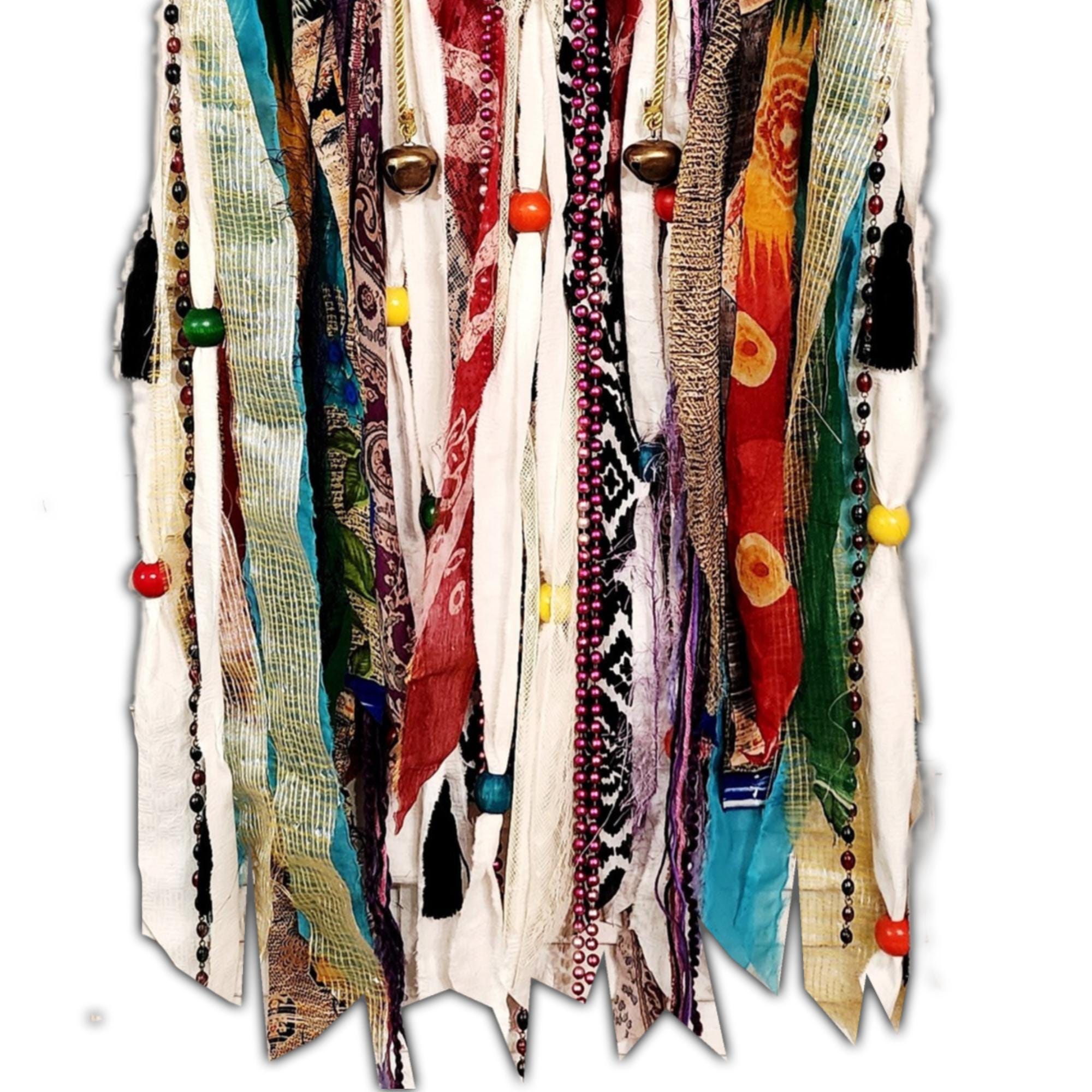 Below, a cascade of colorful fabric ribbons, lace strips, and patterned textiles flow freely, creating a lively and textured display.