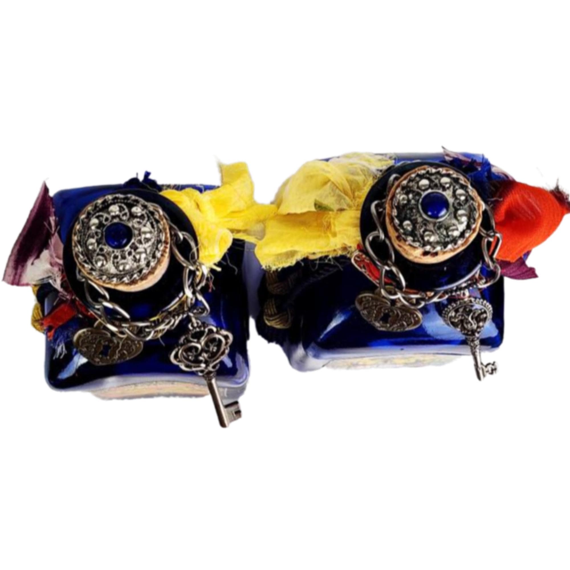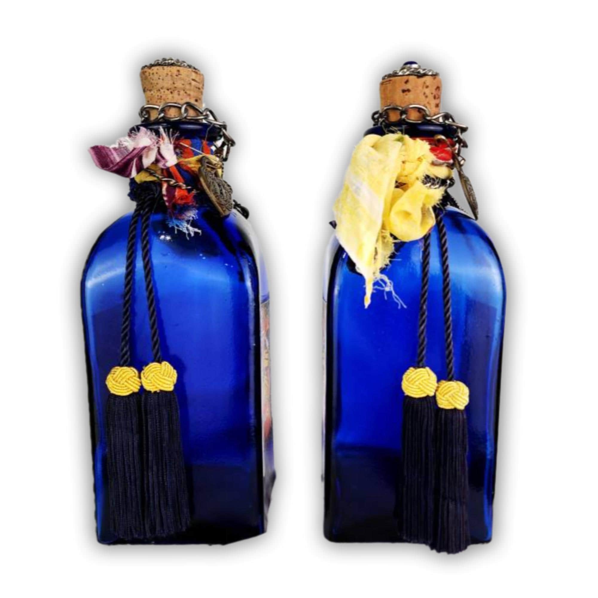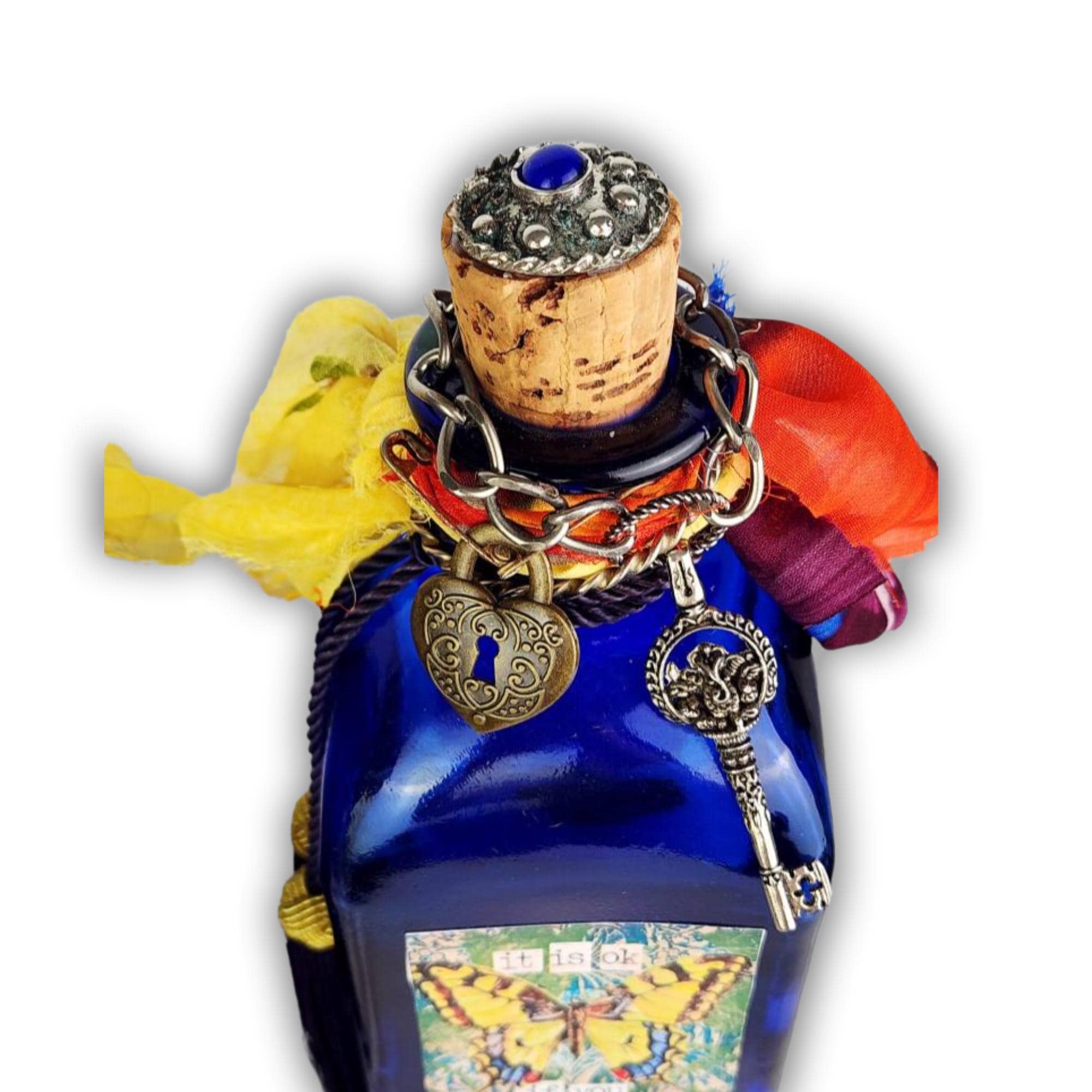 Around the bottle’s neck, colorful fabric ribbons in shades of yellow, red, and orange are tied together, accented with metal charms, including a heart and key, symbolizing love and discovery. A cobalt blue and gold tassel drapes elegantly from the side, adding texture and movement.