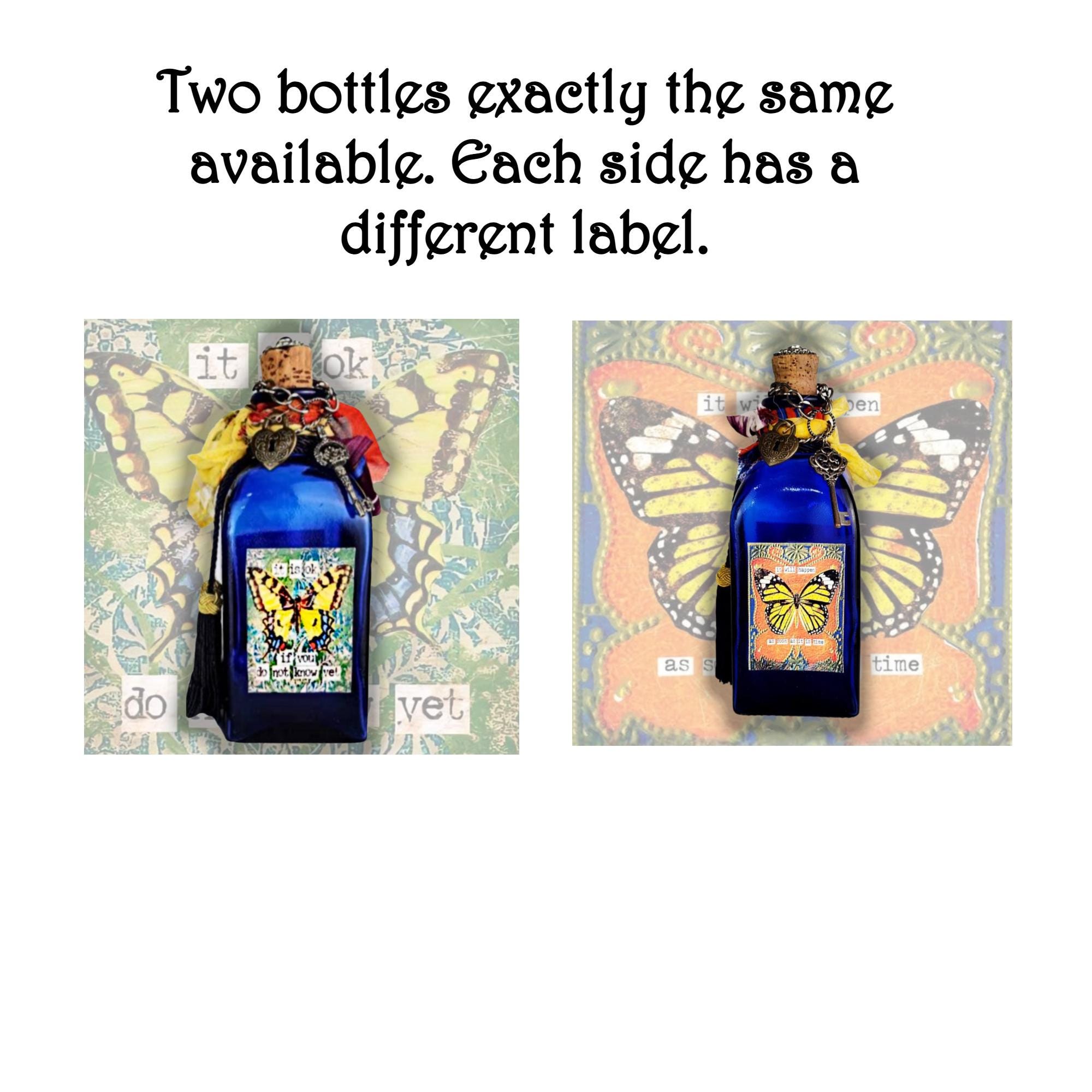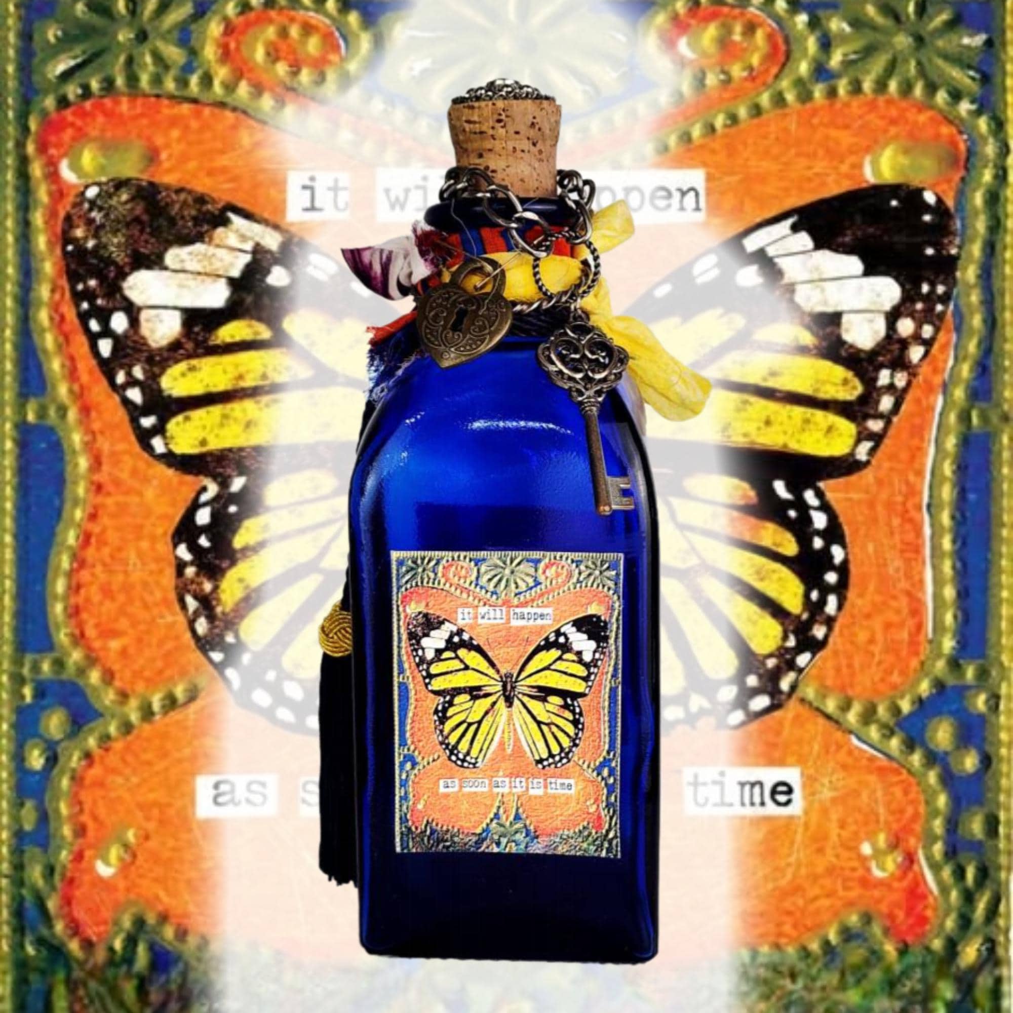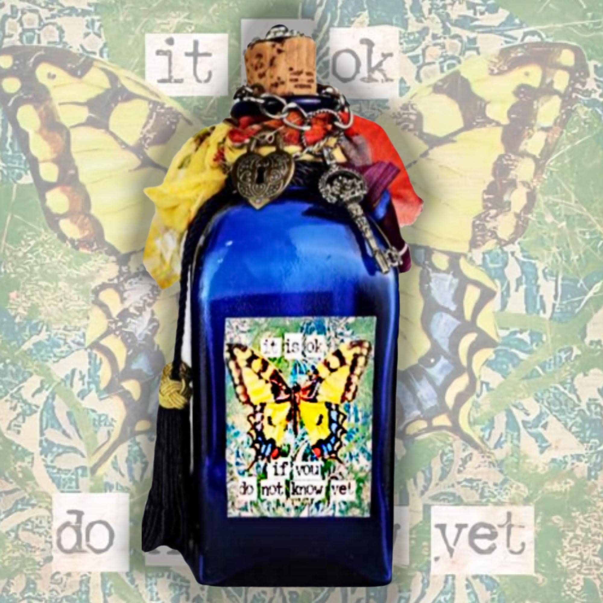 A striking altered art bottle crafted from deep cobalt blue glass, radiating creativity and meaning. The front features a vibrant butterfly artwork with an inspirational message that reads, “It is ok if you do not know yet.” The other side reads, "It will happen as soon as it is time." The design blends bright yellows, blues, and greens, giving the piece a lively, expressive feel.