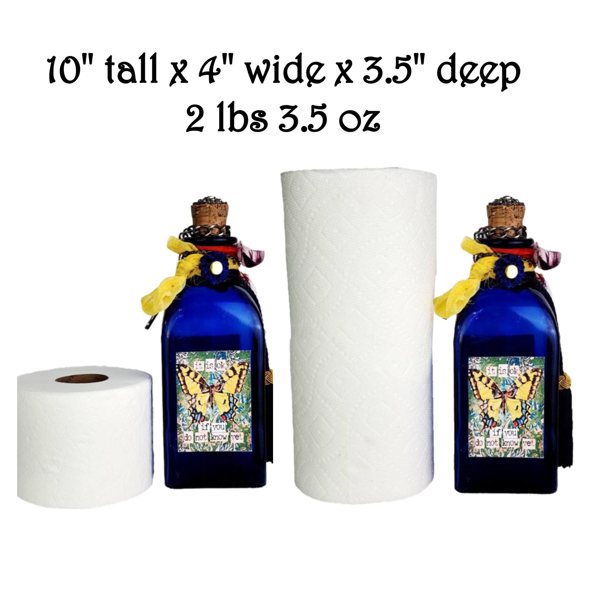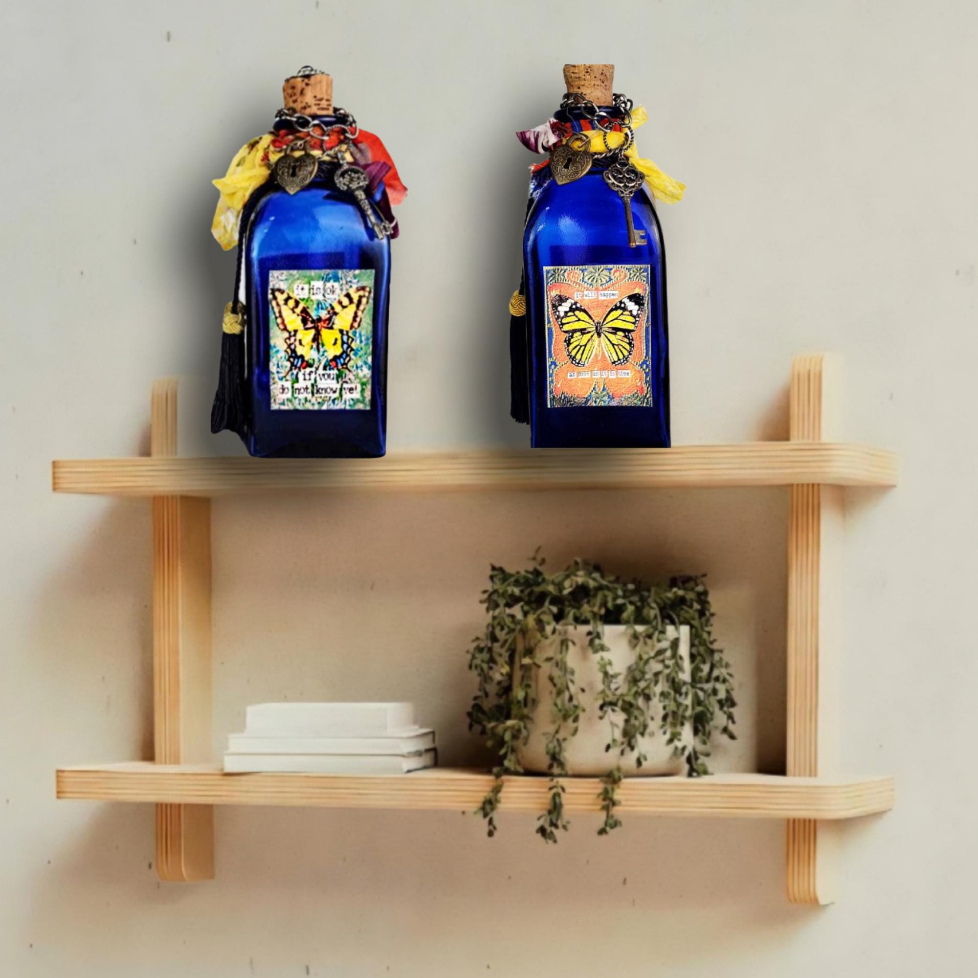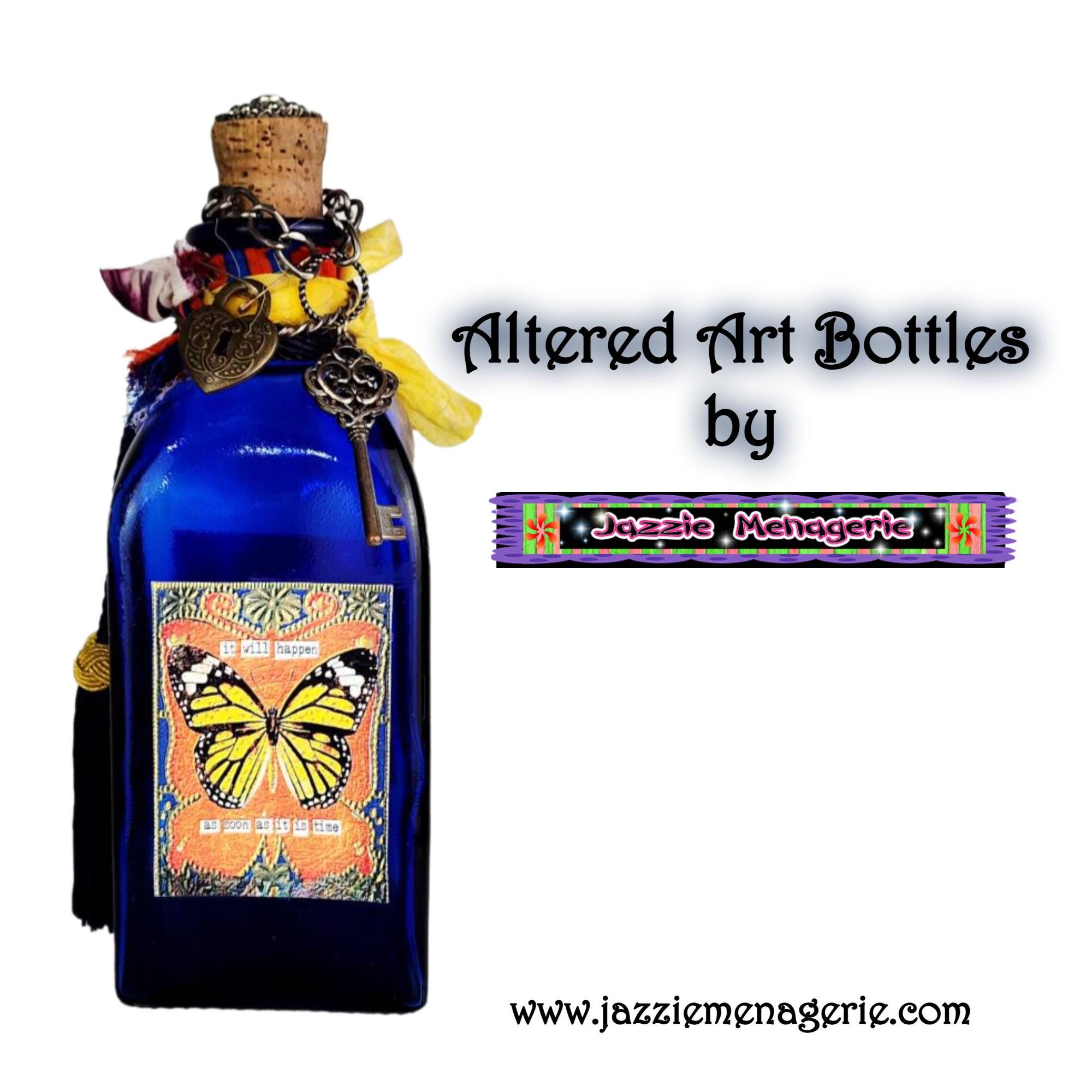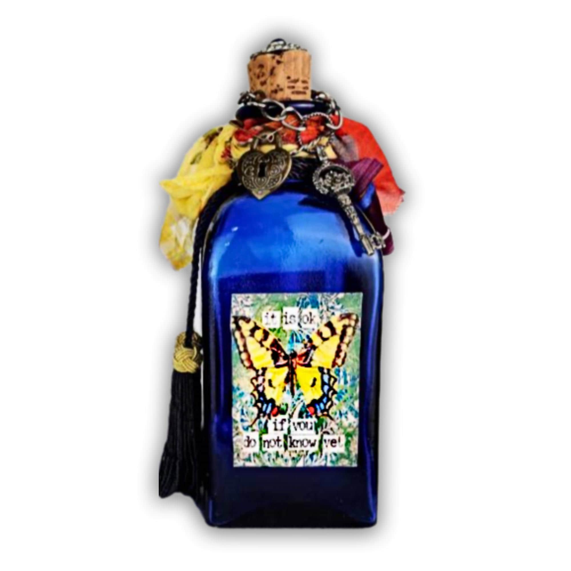 A striking altered art bottle crafted from deep cobalt blue glass, radiating creativity and meaning. The front features a vibrant butterfly artwork with an inspirational message that reads, “It is ok if you do not know yet.” The other side reads, "It will happen as soon as it is time." The design blends bright yellows, blues, and greens, giving the piece a lively, expressive feel.