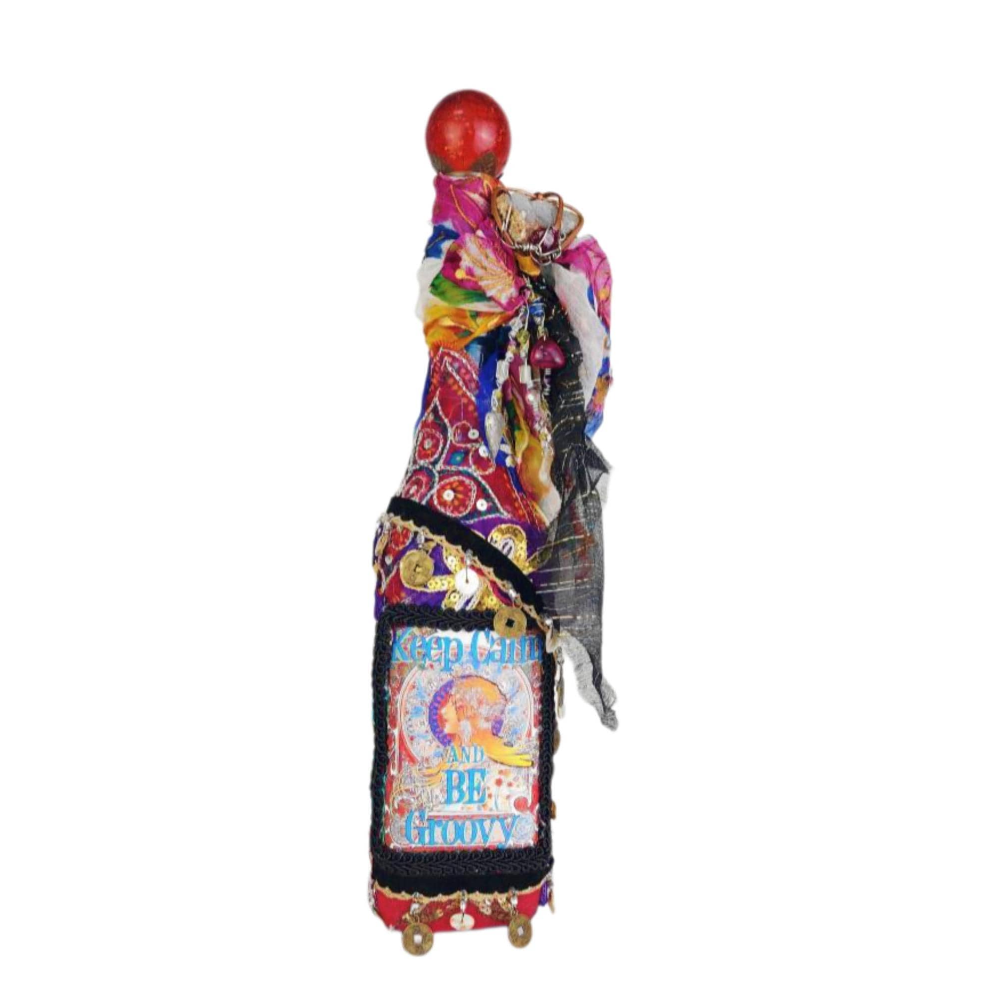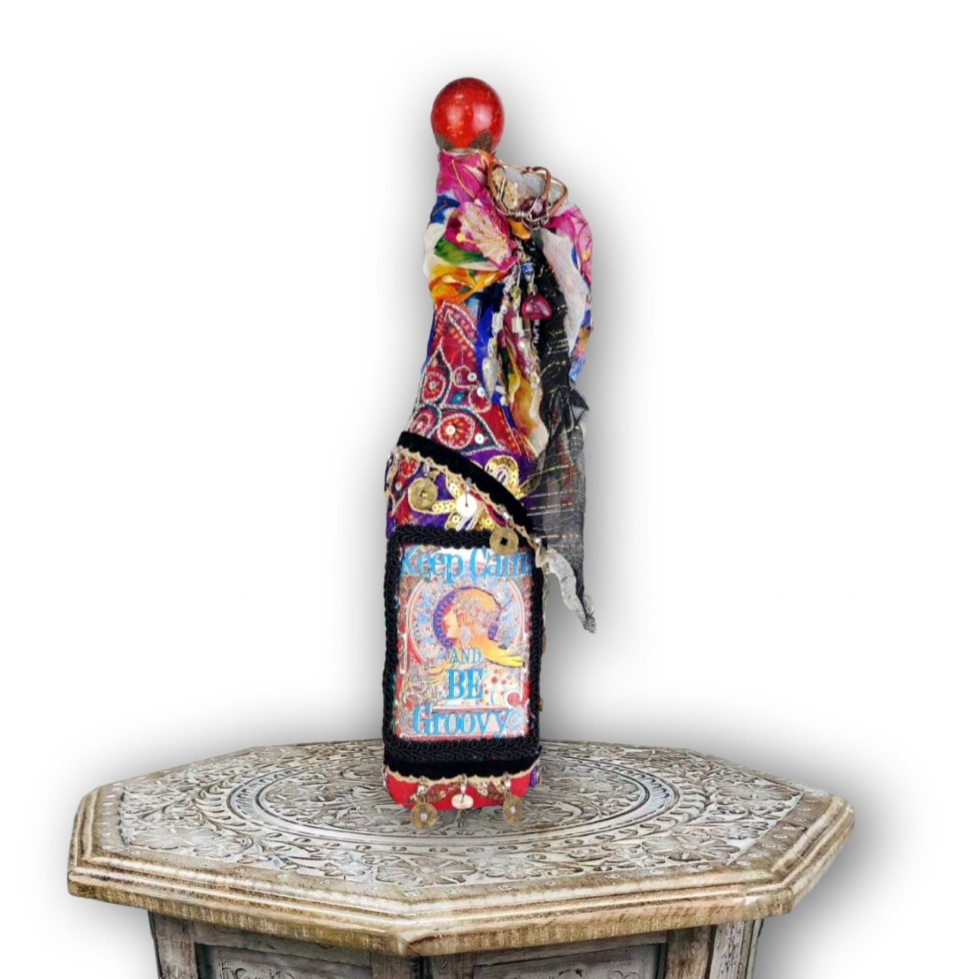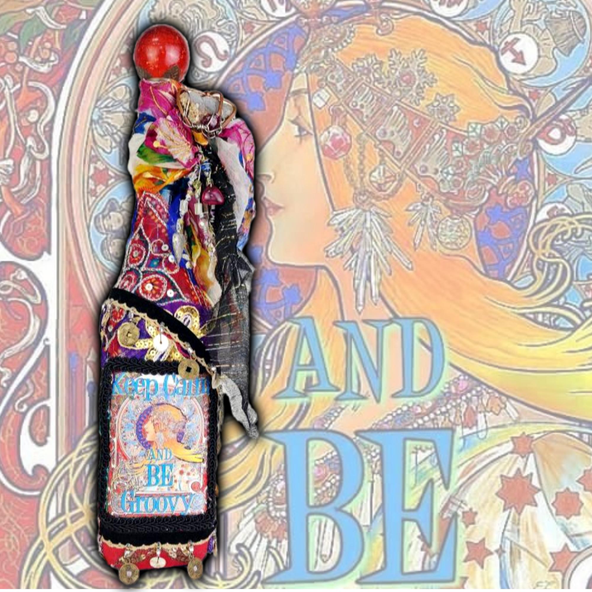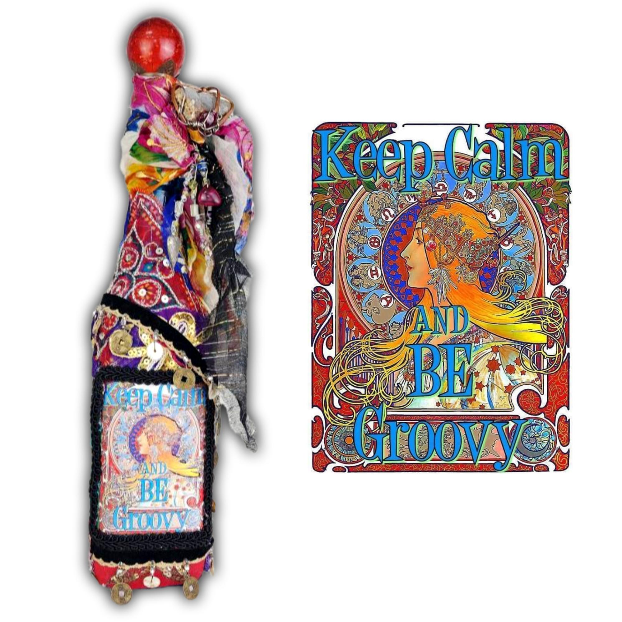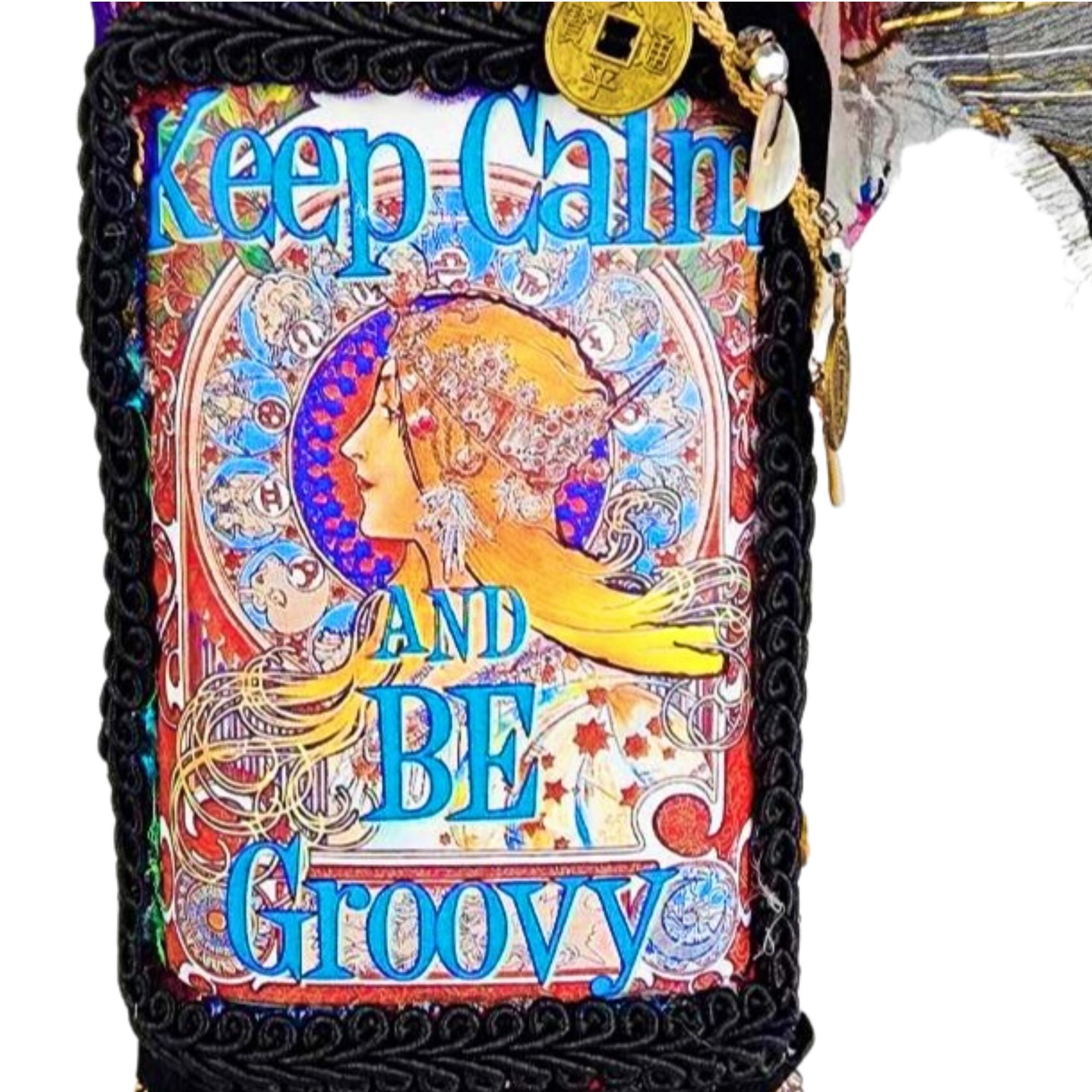 A vibrant and eclectic altered art bottle bursting with color, creativity, and bohemian spirit. This one-of-a-kind piece features a bold design with the phrase “Keep Calm and Be Groovy” framed by a retro-inspired image and surrounded by layers of textured embellishments.