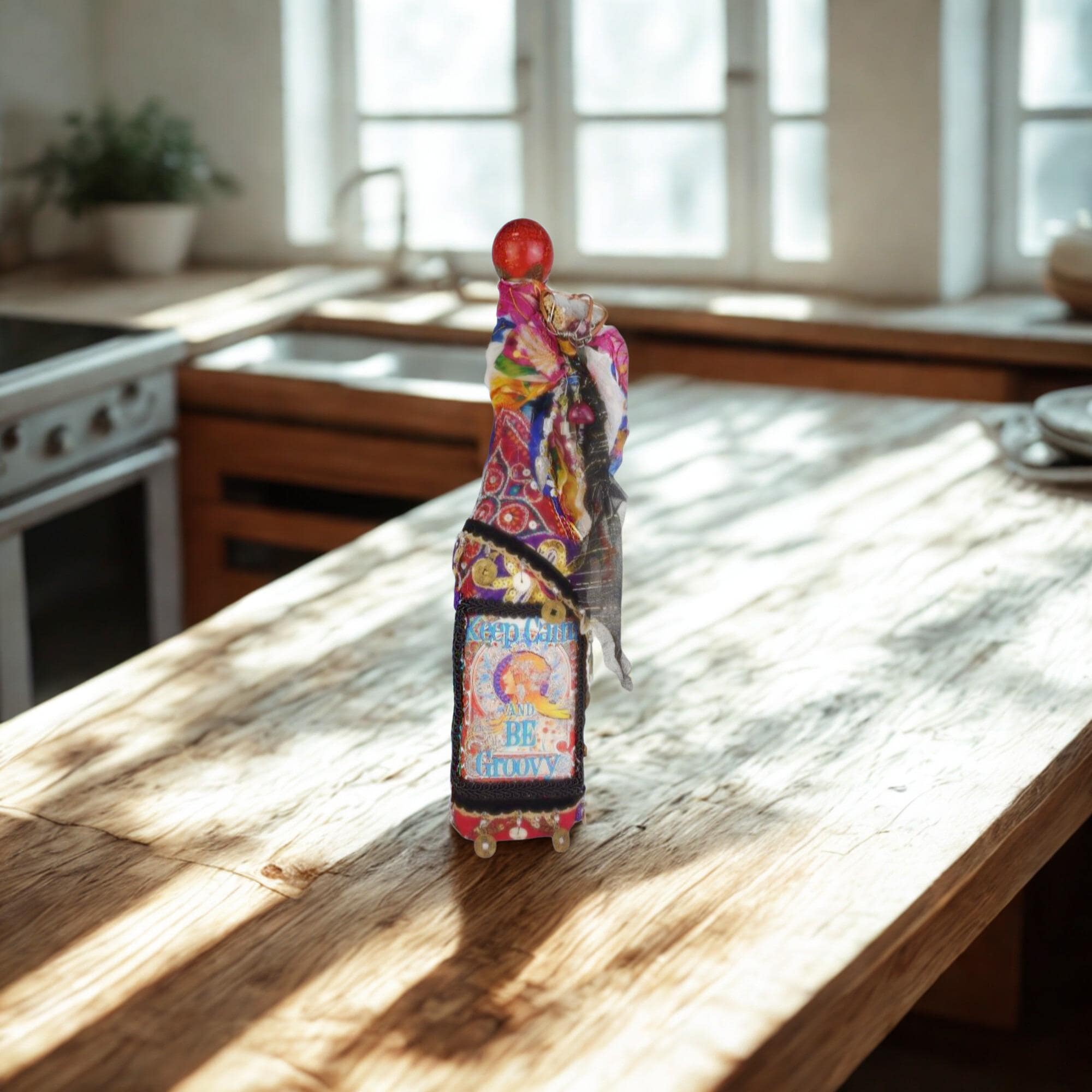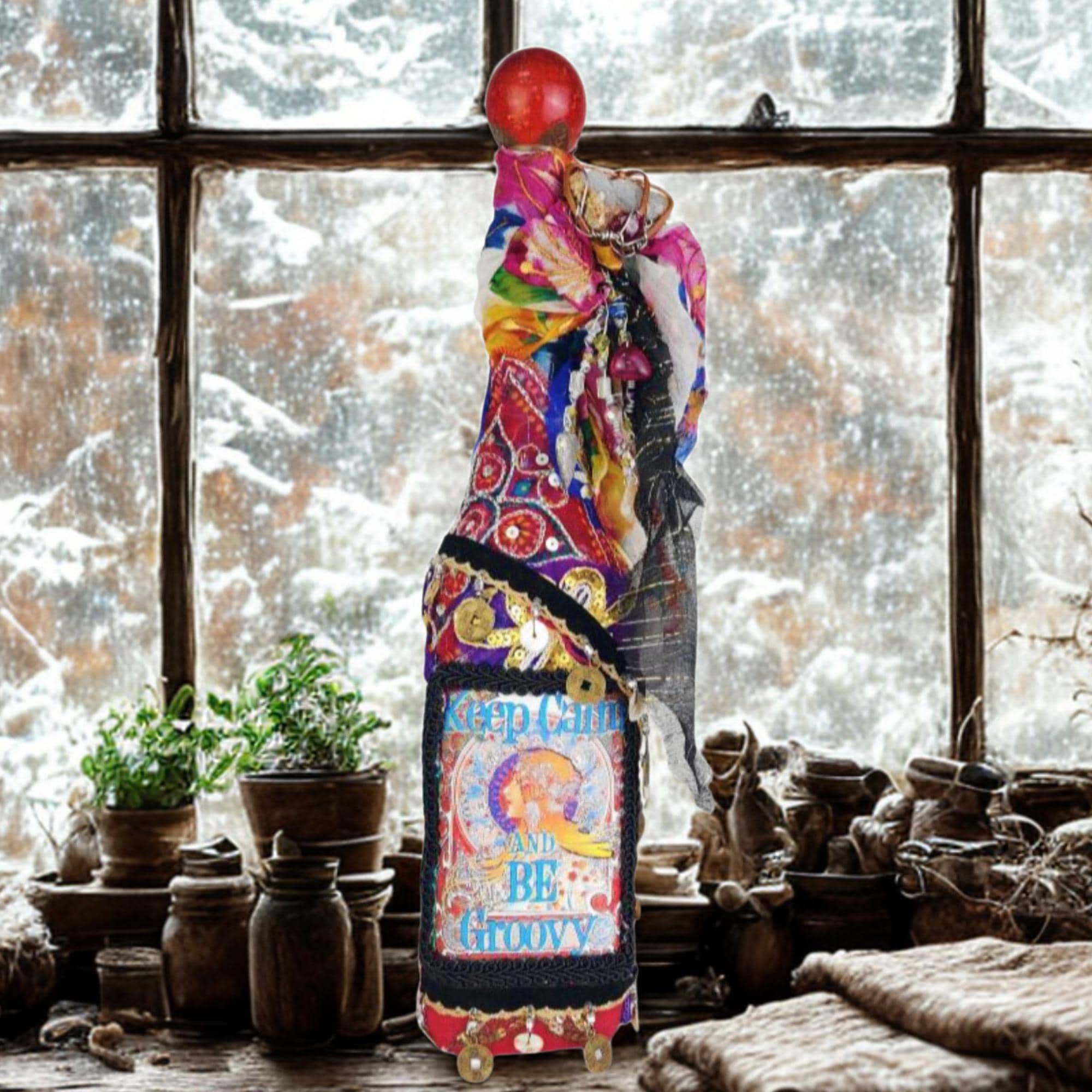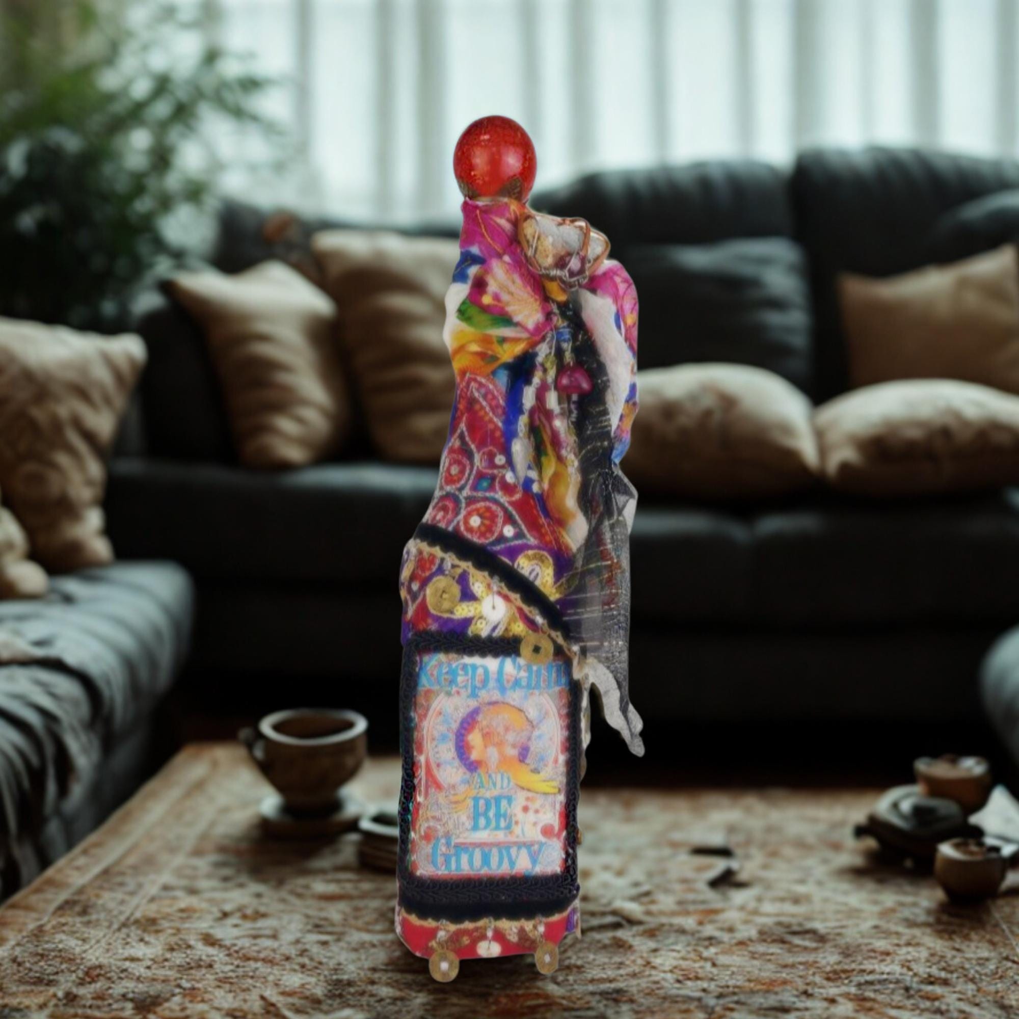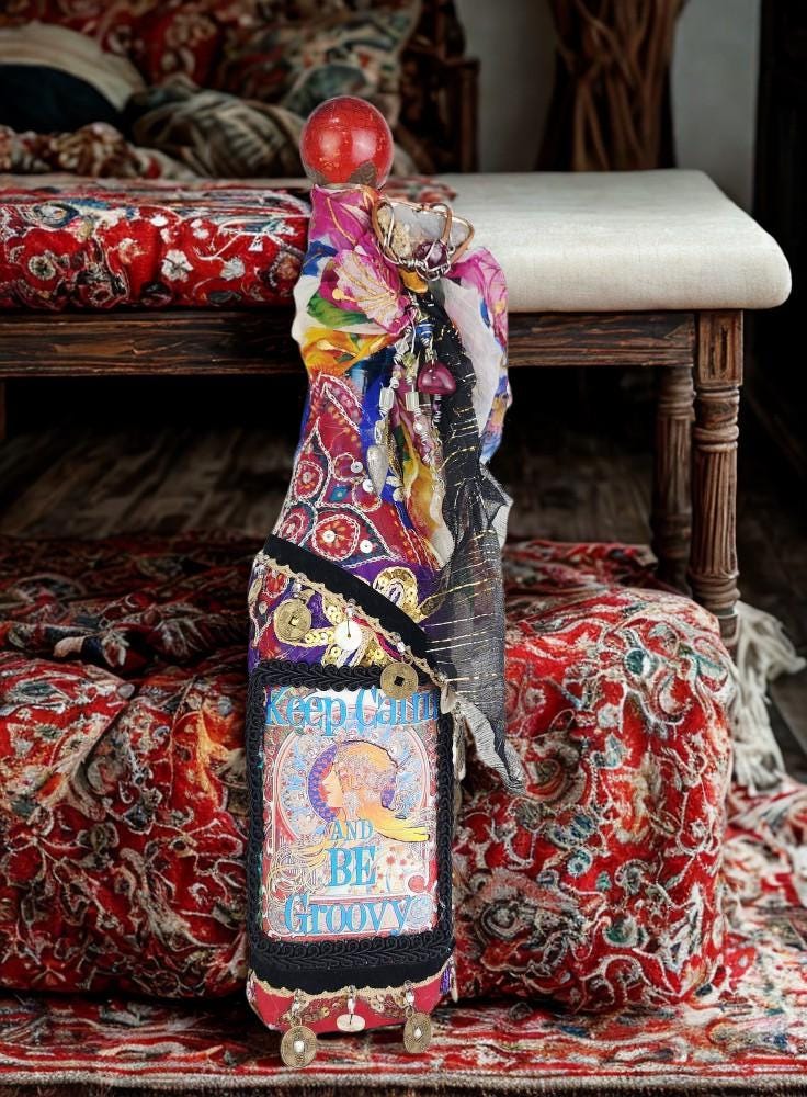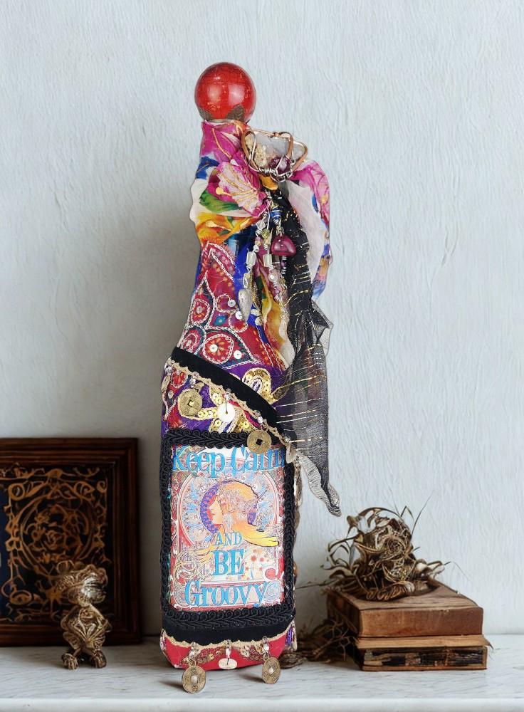 A vibrant and eclectic altered art bottle bursting with color, creativity, and bohemian spirit. This one-of-a-kind piece features a bold design with the phrase “Keep Calm and Be Groovy” framed by a retro-inspired image and surrounded by layers of textured embellishments.