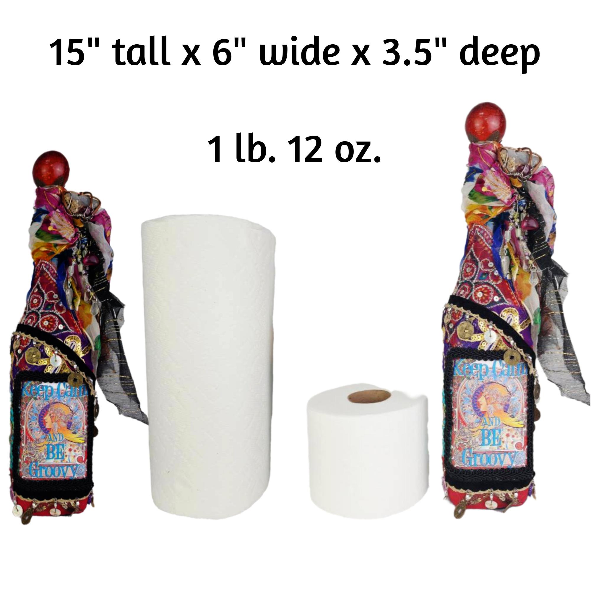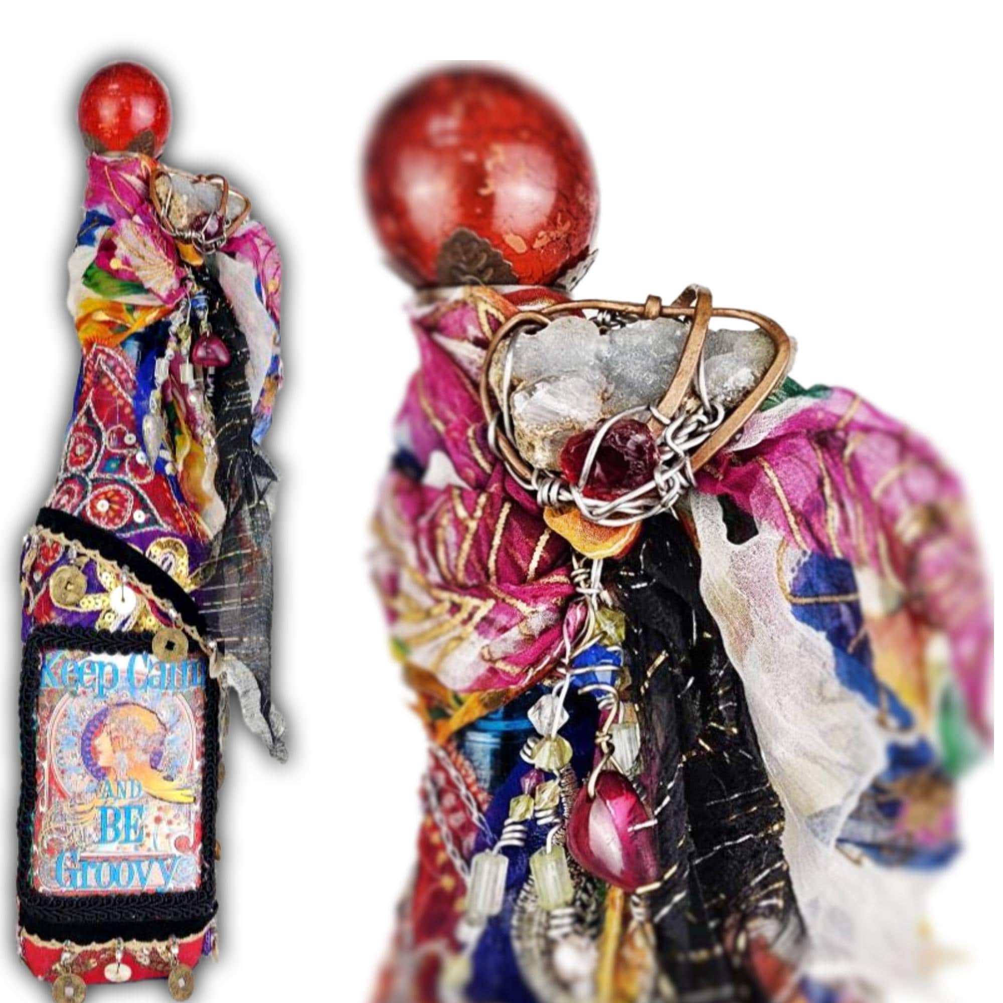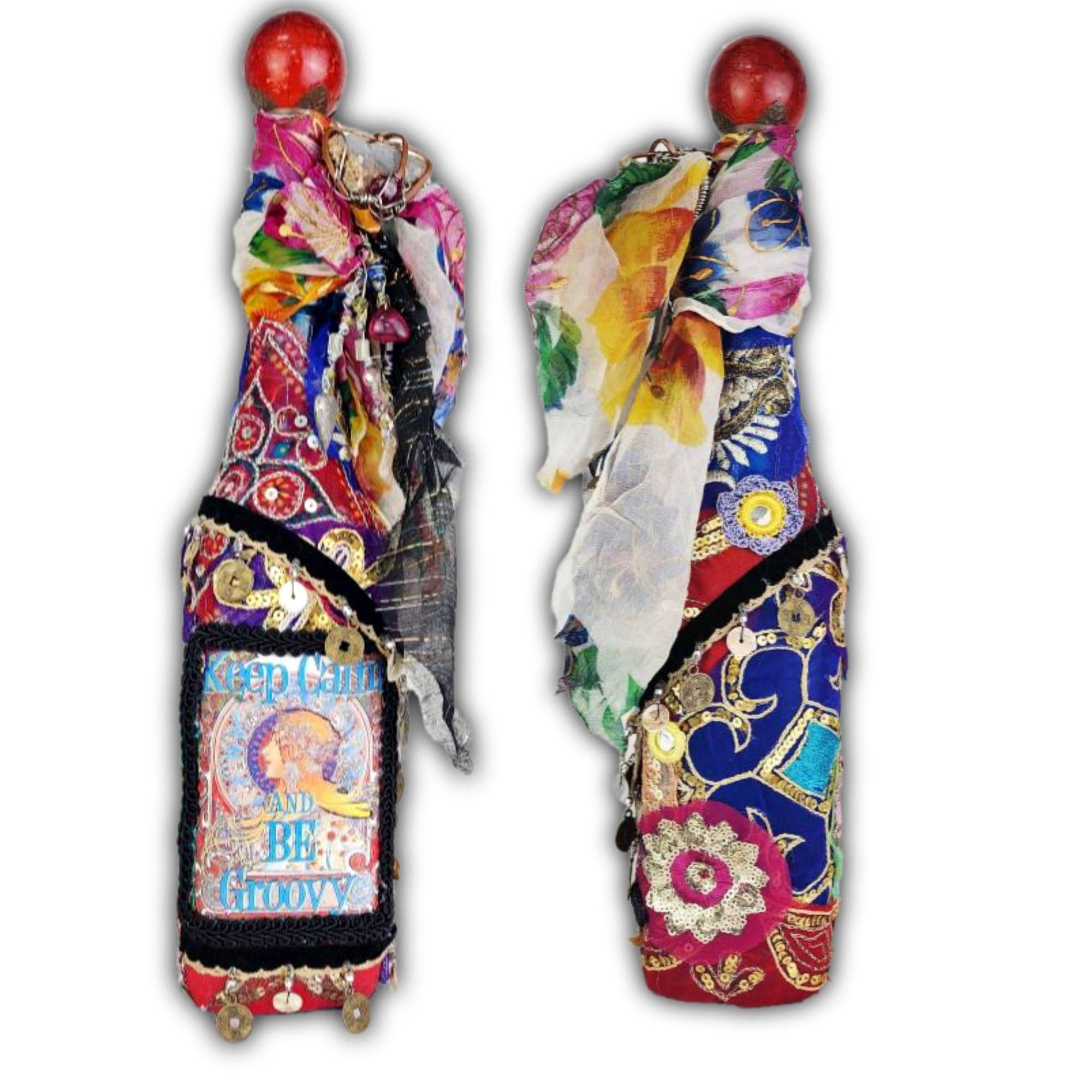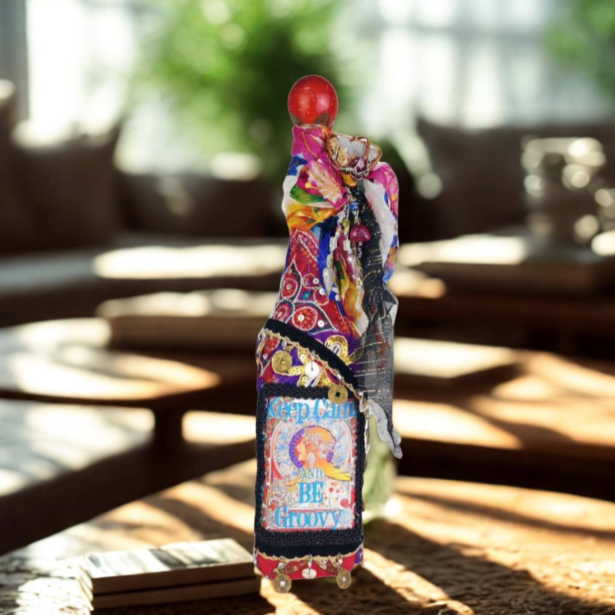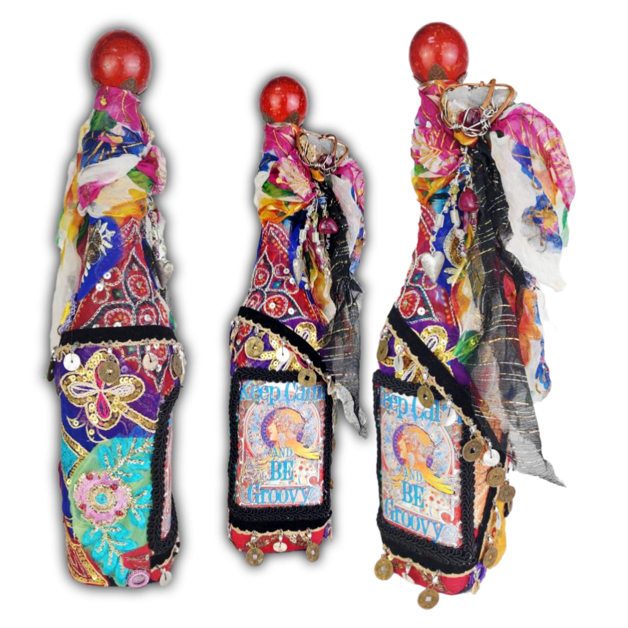 A vibrant and eclectic altered art bottle bursting with color, creativity, and bohemian spirit. This one-of-a-kind piece features a bold design with the phrase “Keep Calm and Be Groovy” framed by a retro-inspired image and surrounded by layers of textured embellishments.