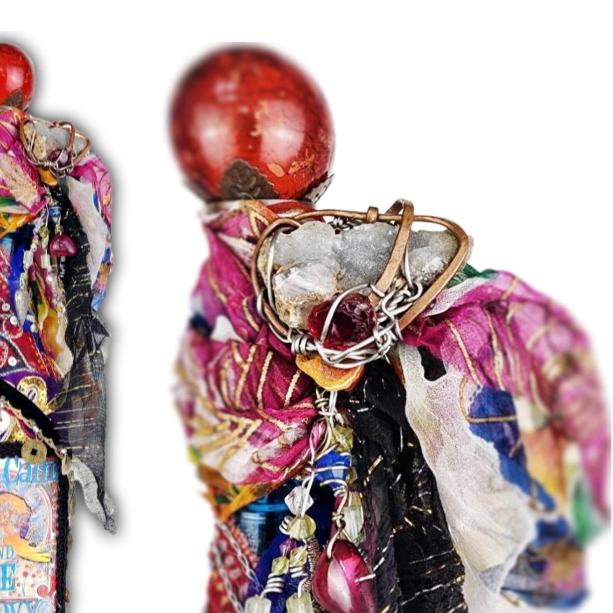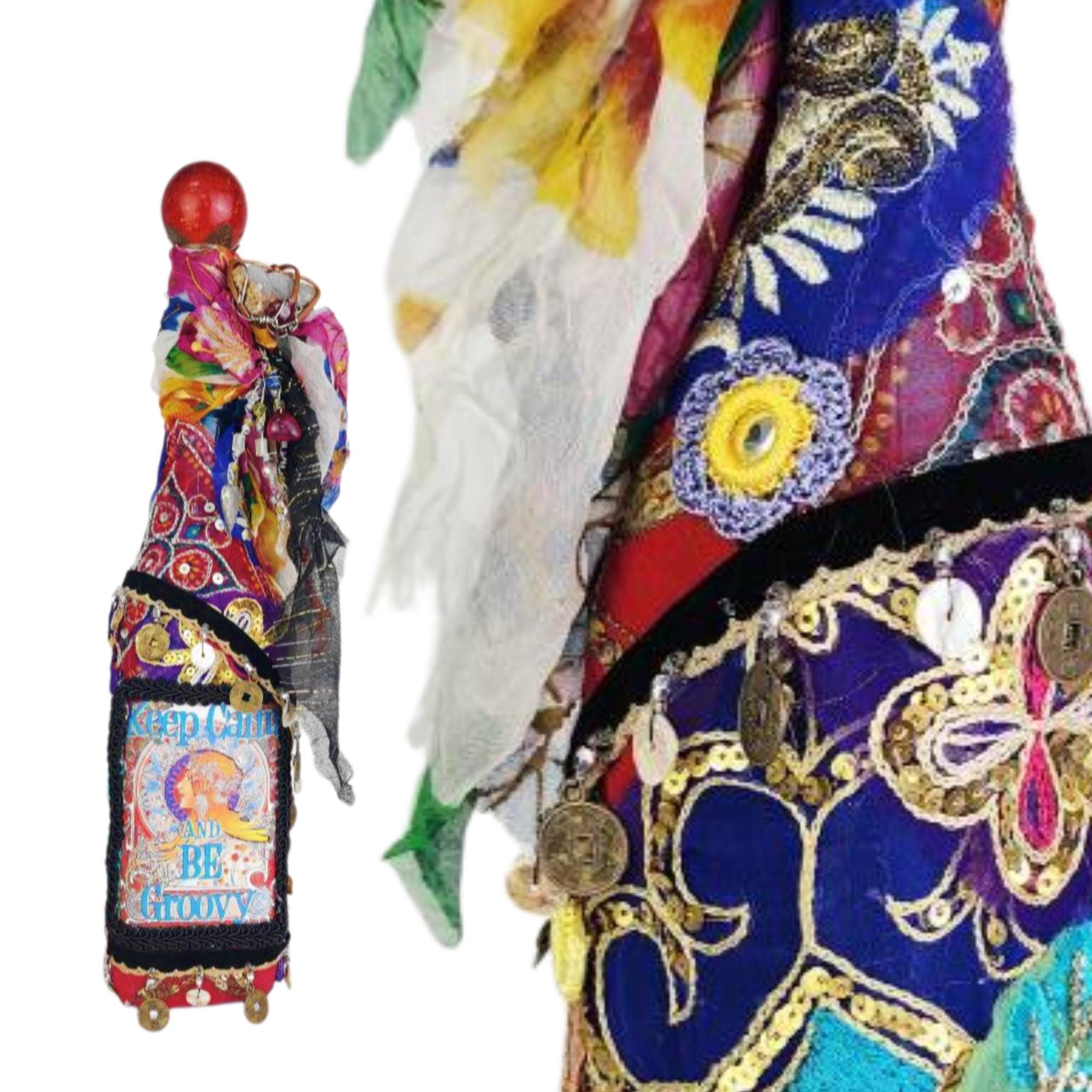 Rich fabrics in red, gold, and multicolored patterns wrap around the bottle, accented with sequins, beads, and lace trims that give it a joyful, free-spirited vibe. The neck is adorned with flowing ribbons and scarves in a rainbow of hues, tied with playful charms and a bright red topper that completes the look.