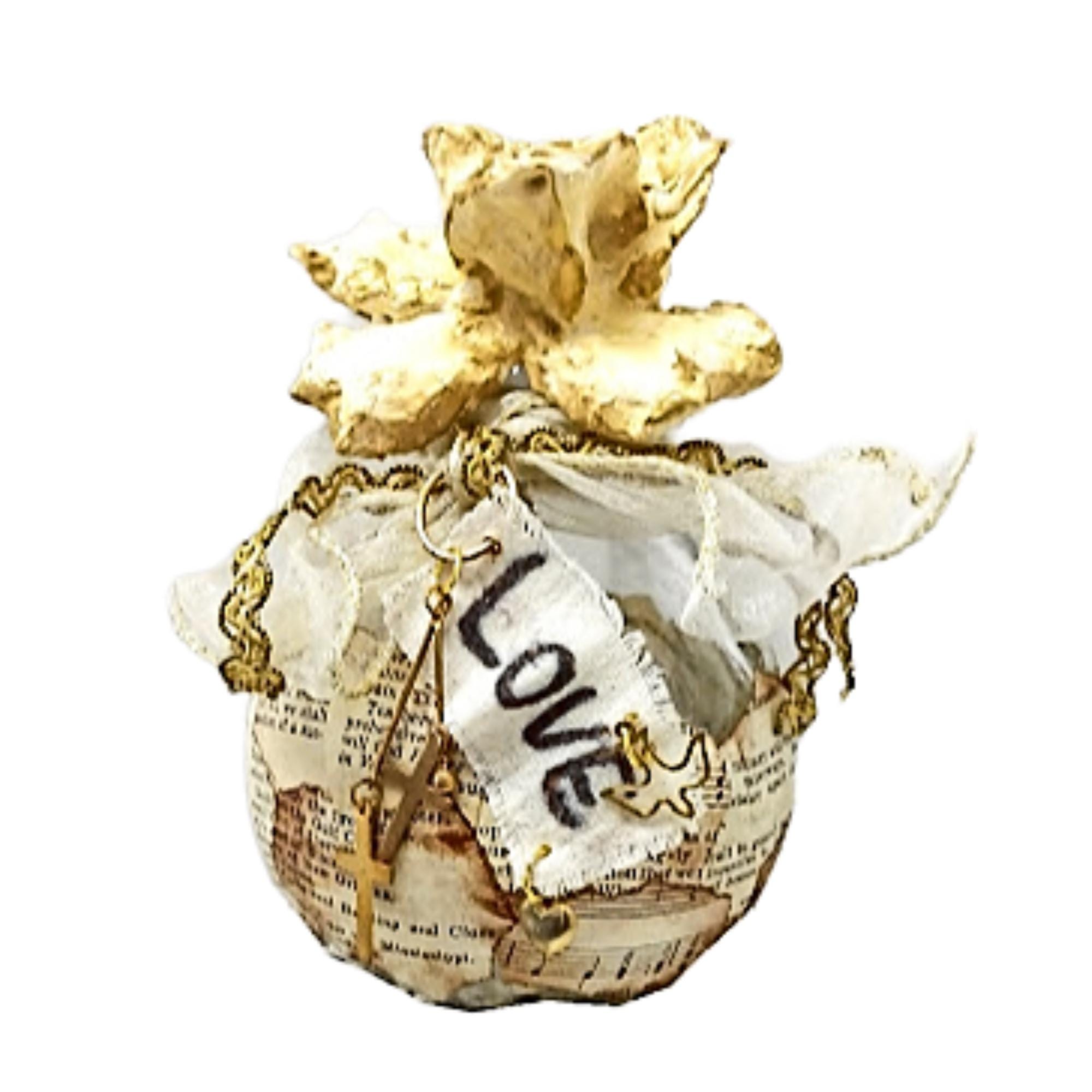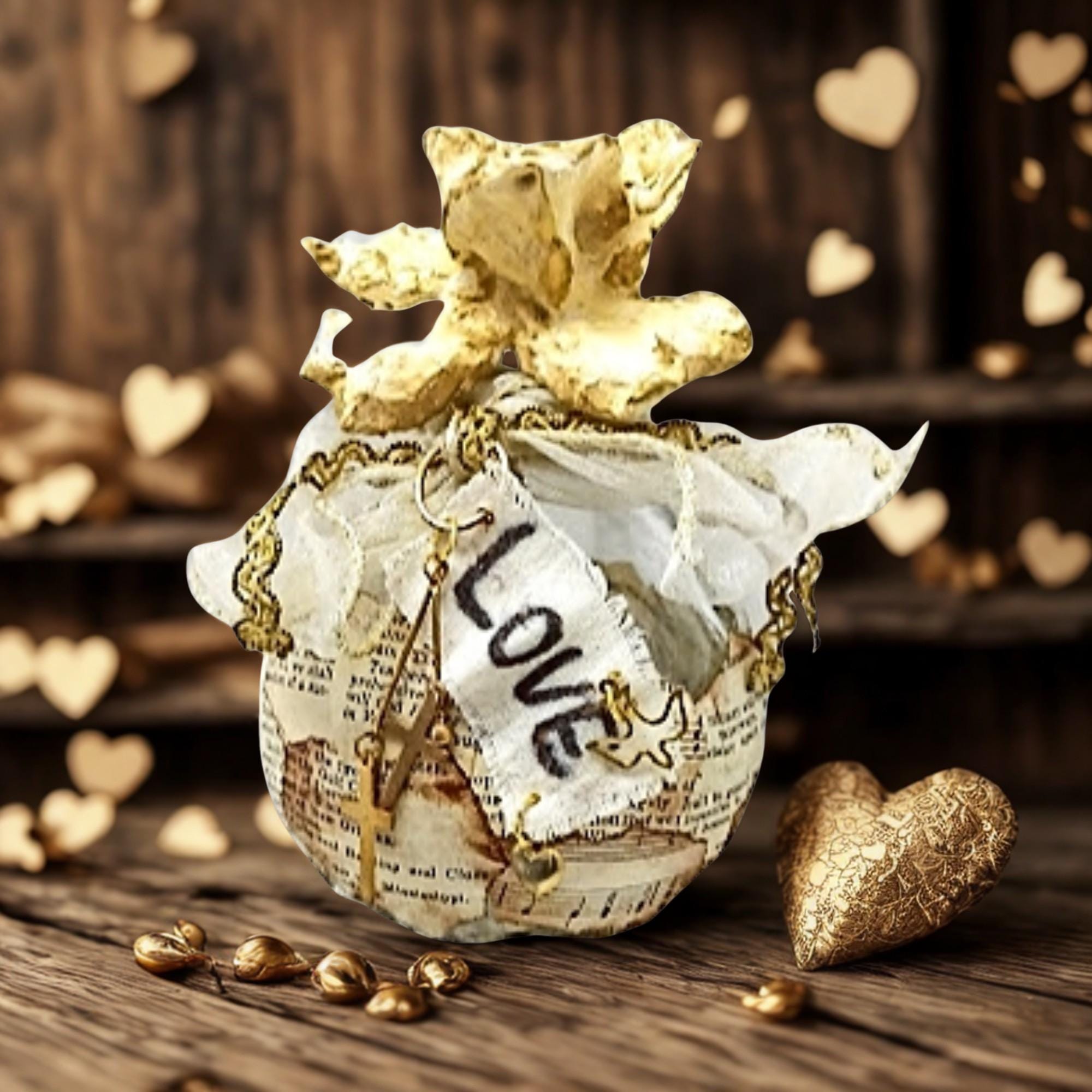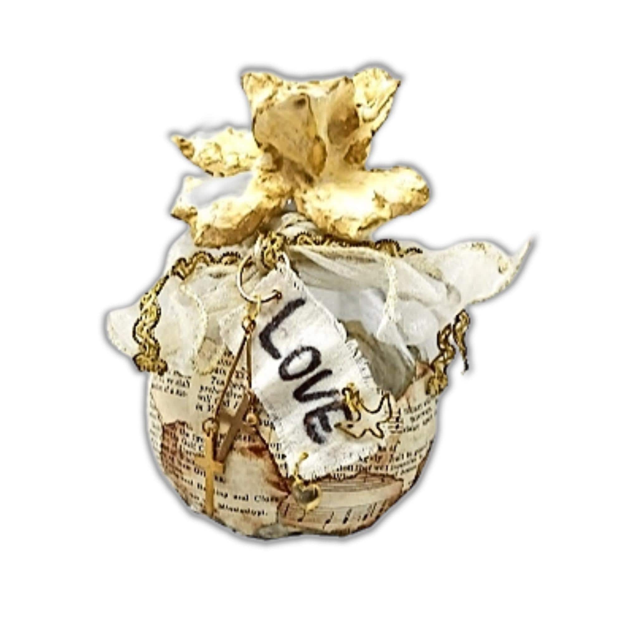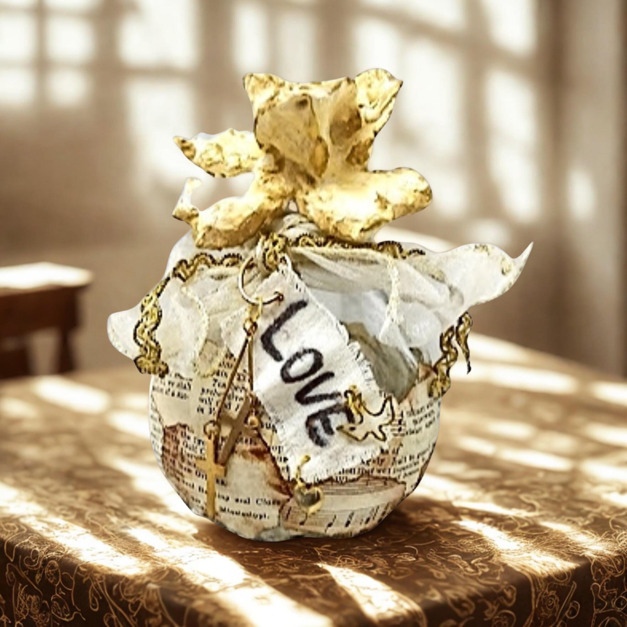 This non-opening container has been hand wrapped in vintage ephemera paper. Edges dyed with shoe polish! Several gold charms you will find such as a heart, a dove and two crosses dingle dangle. The altered bottle will serve as a bright and happy reminder how precious and loved that you are.