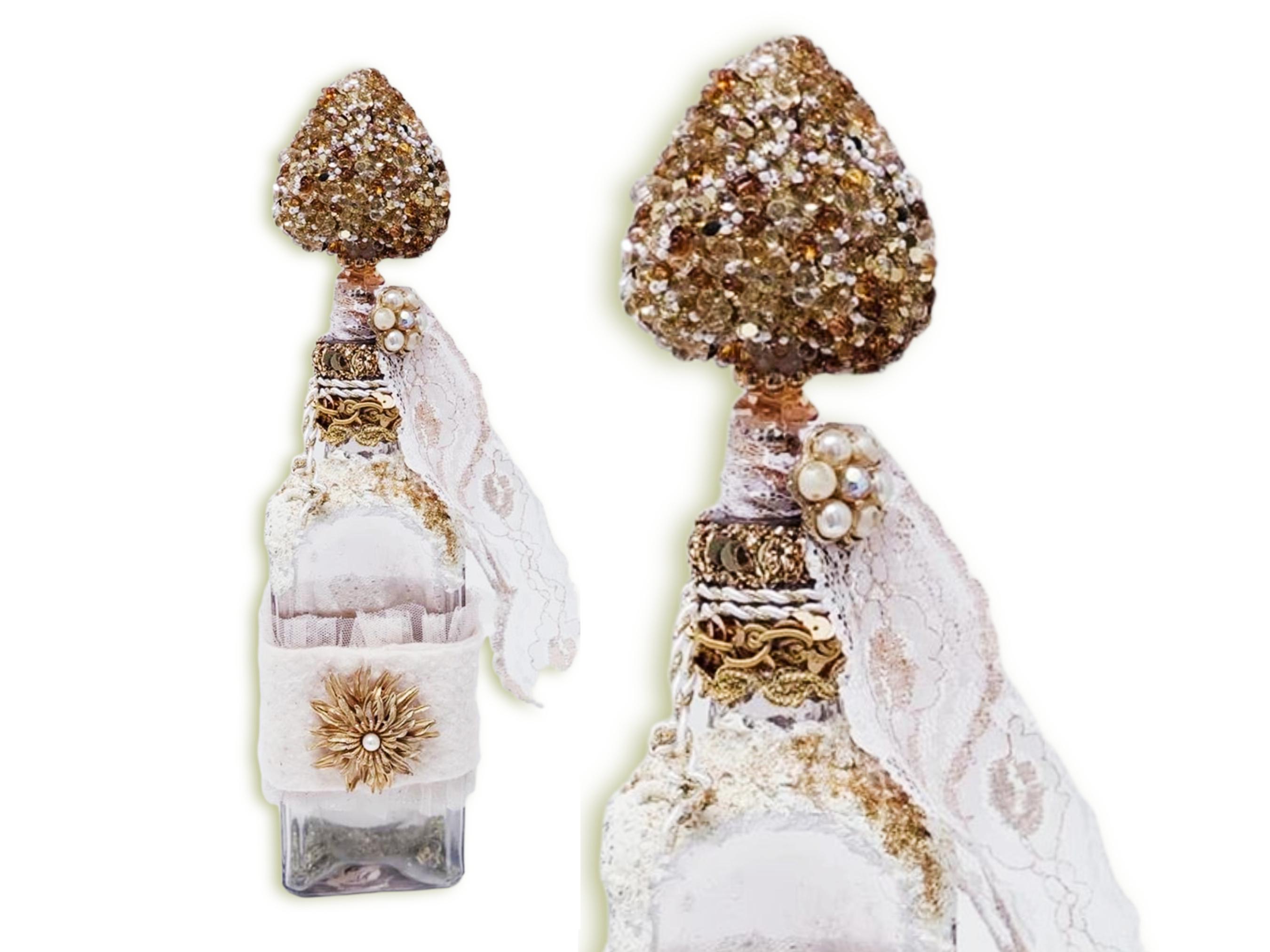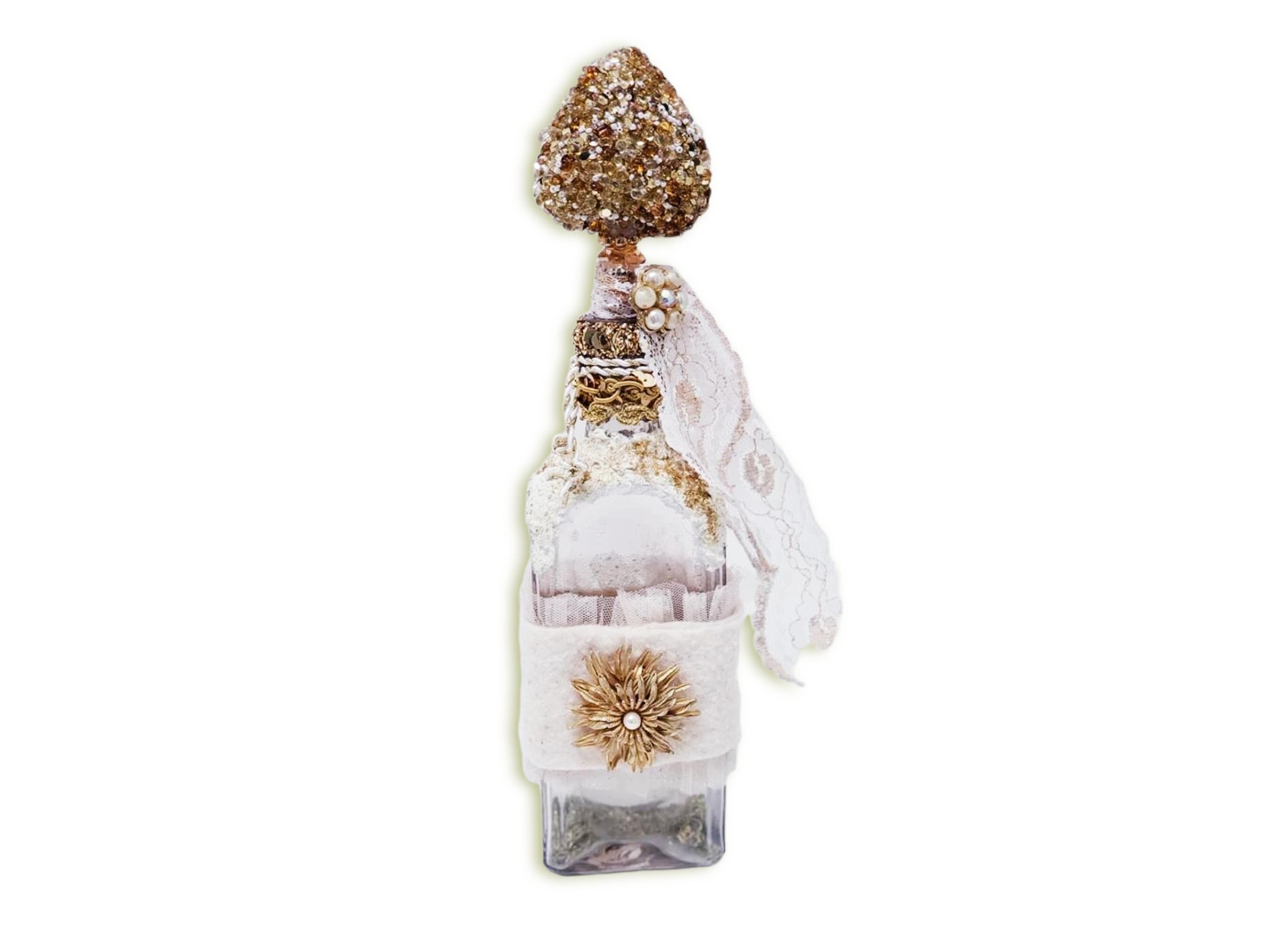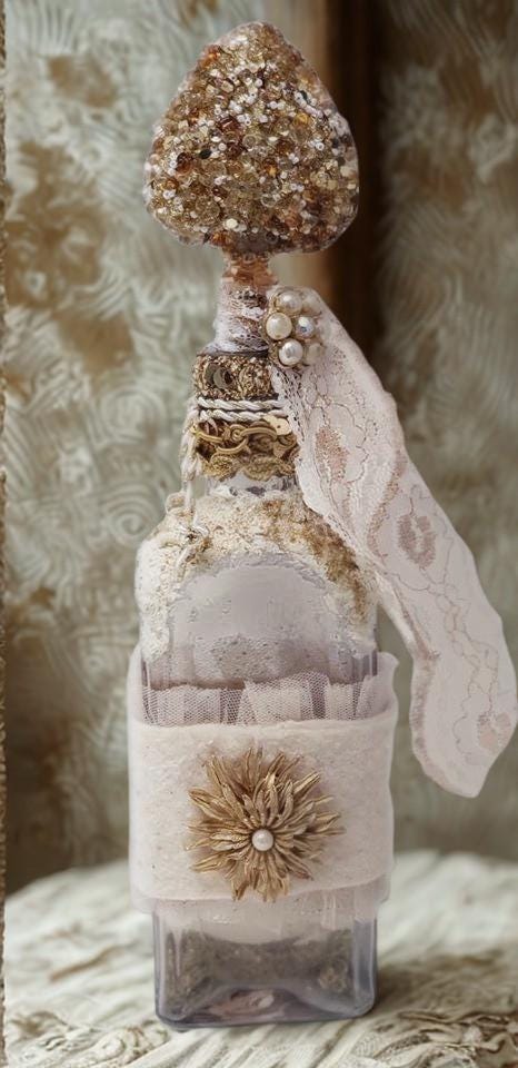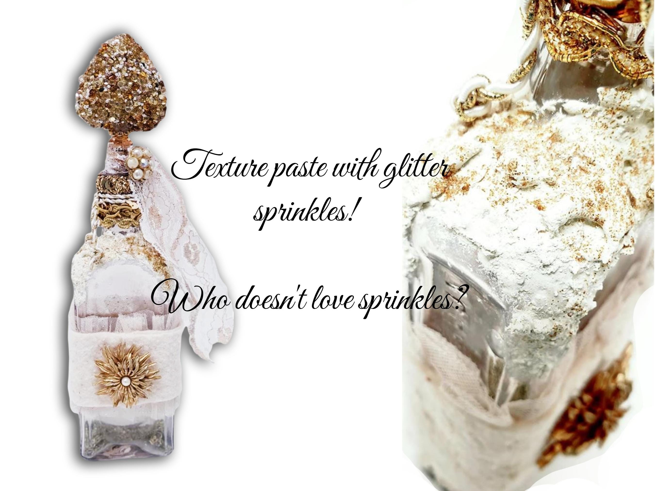 Another interesting notation to be made about this glamorous altered Vintage bottle, is the use of texture paste around the shoulders of the bottle. It dries rock hard like cement, then I sprinkled more gold glitter blingage.