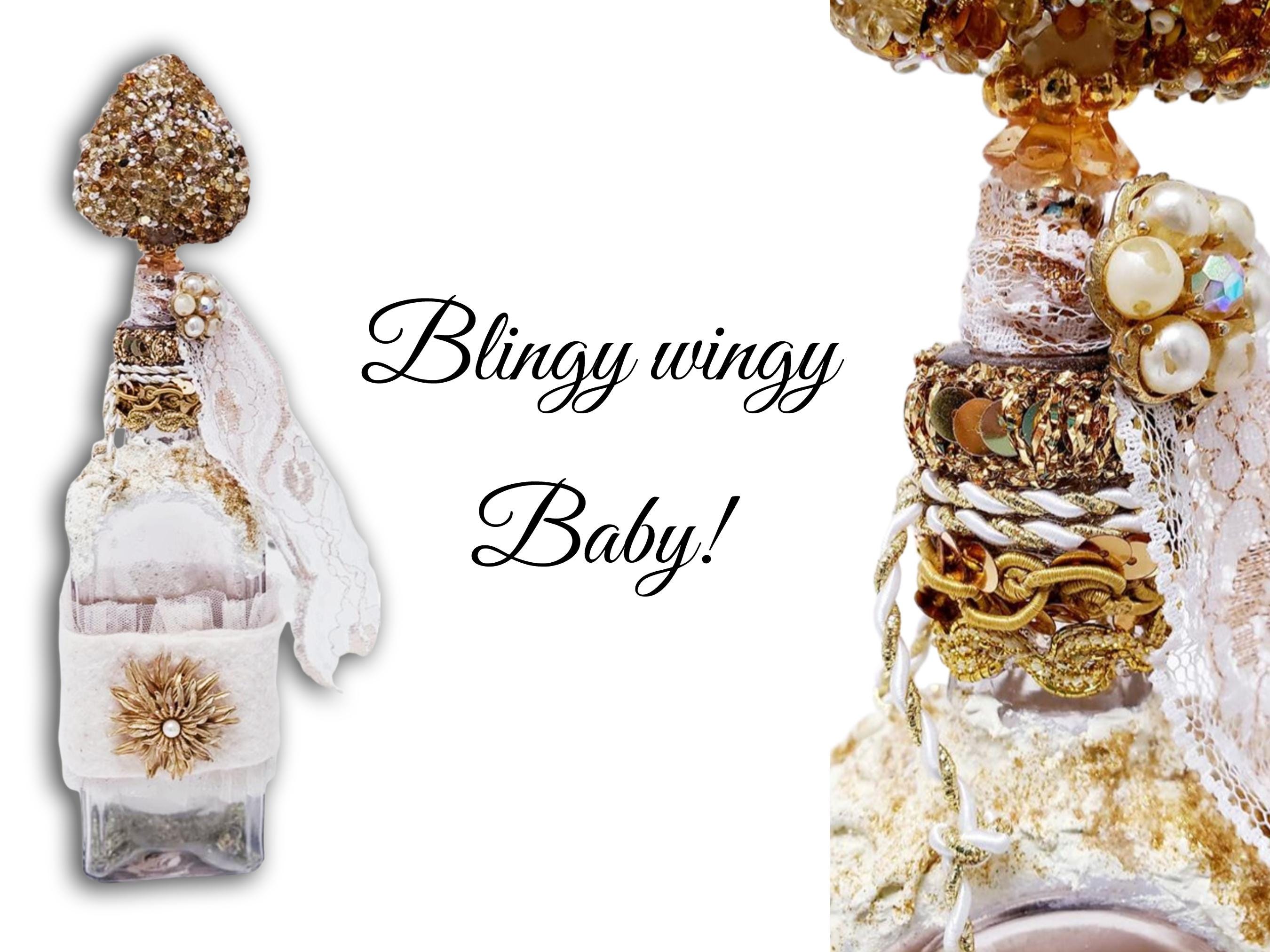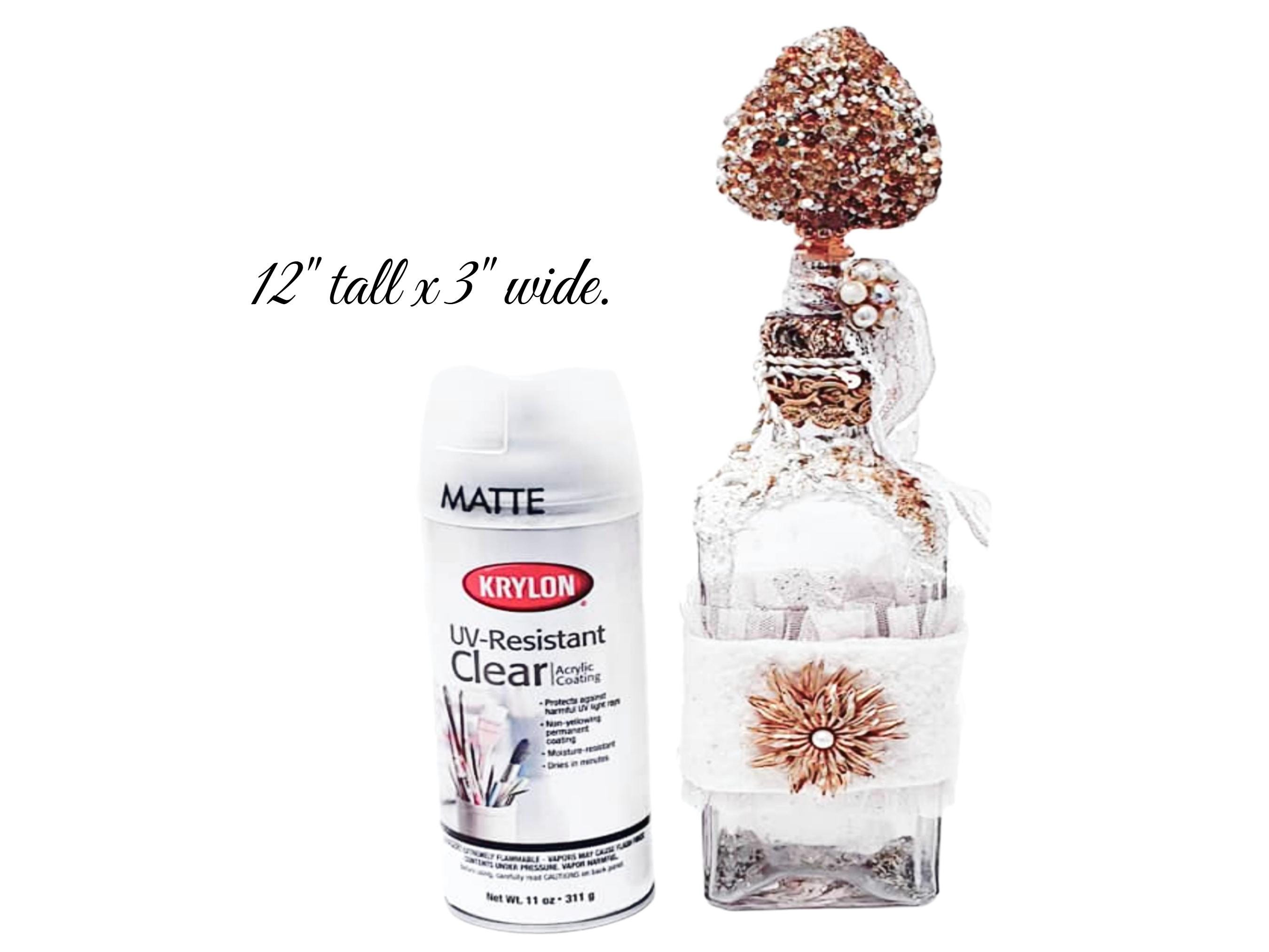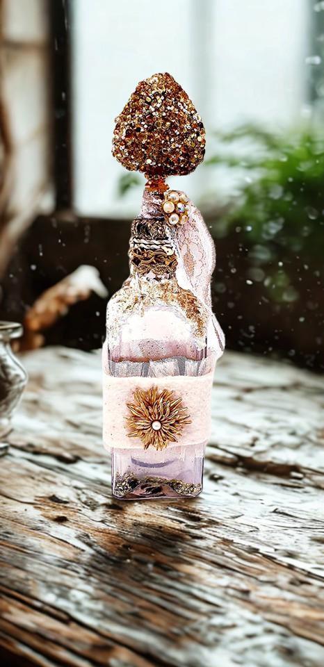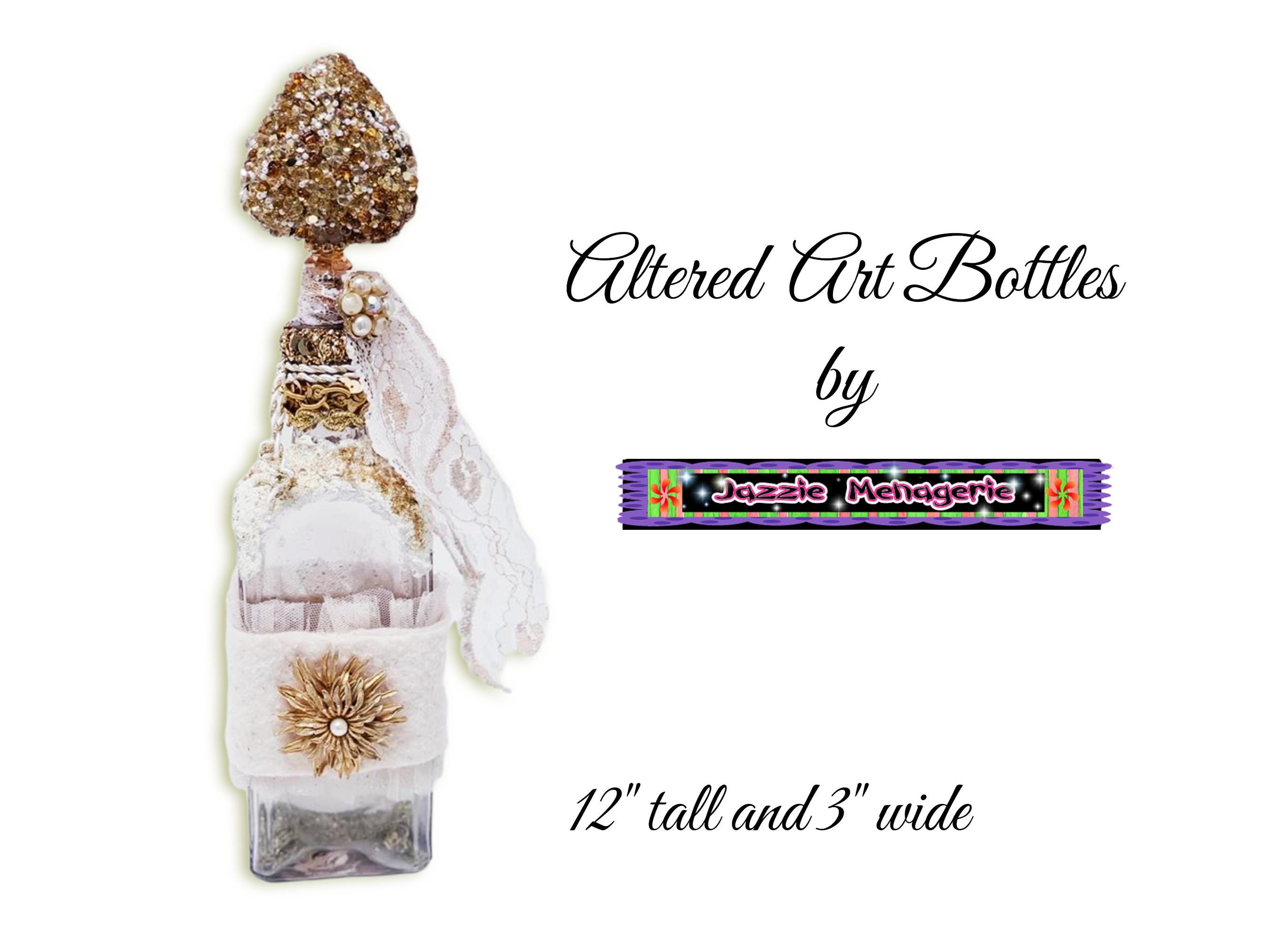 Another interesting notation to be made about this glamorous altered Vintage bottle, is the use of texture paste around the shoulders of the bottle. It dries rock hard like cement, then I sprinkled more gold glitter blingage.