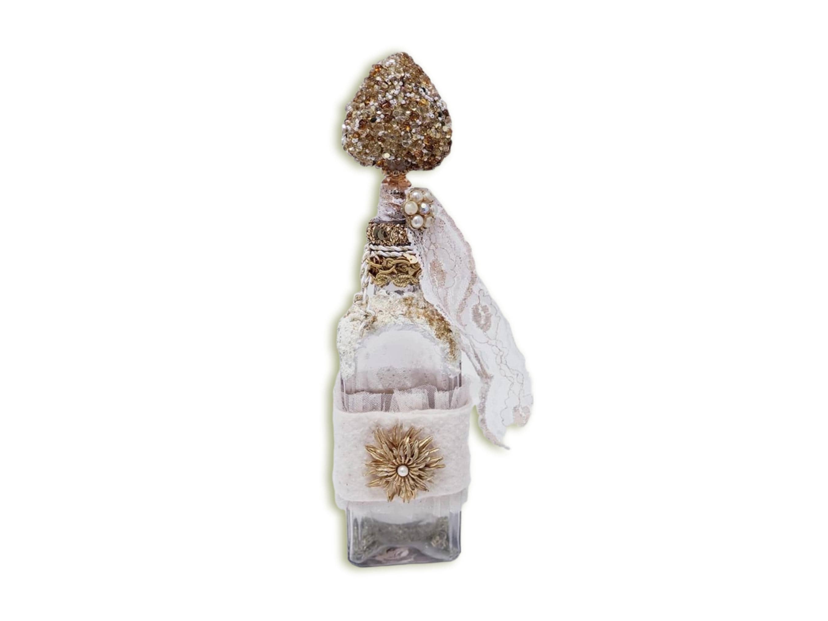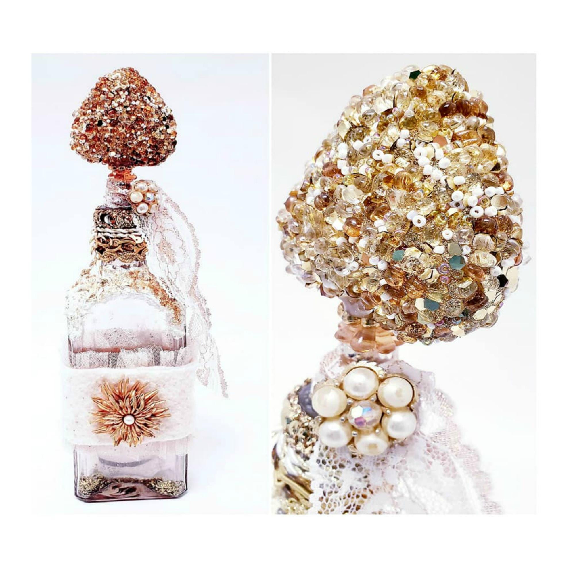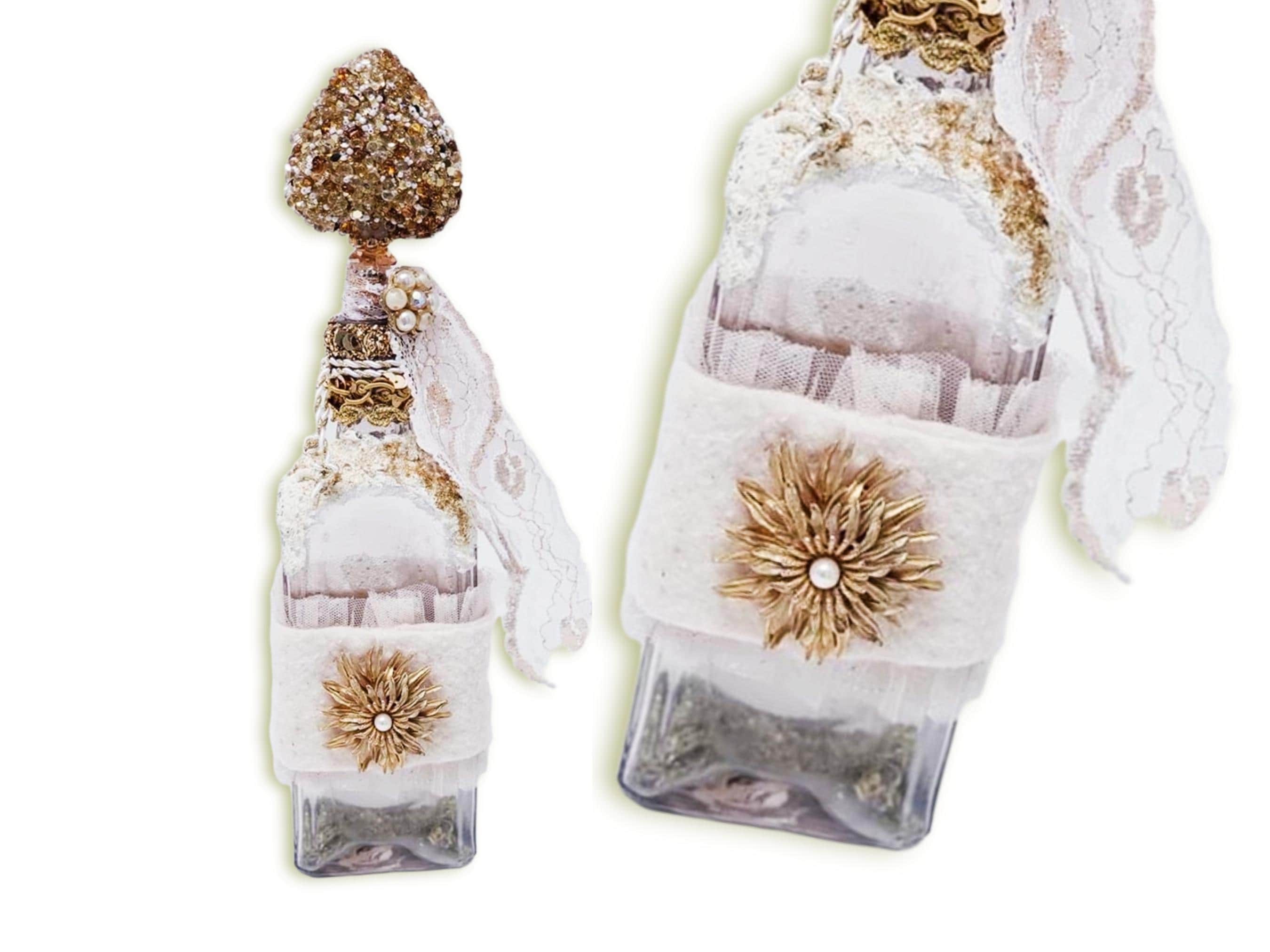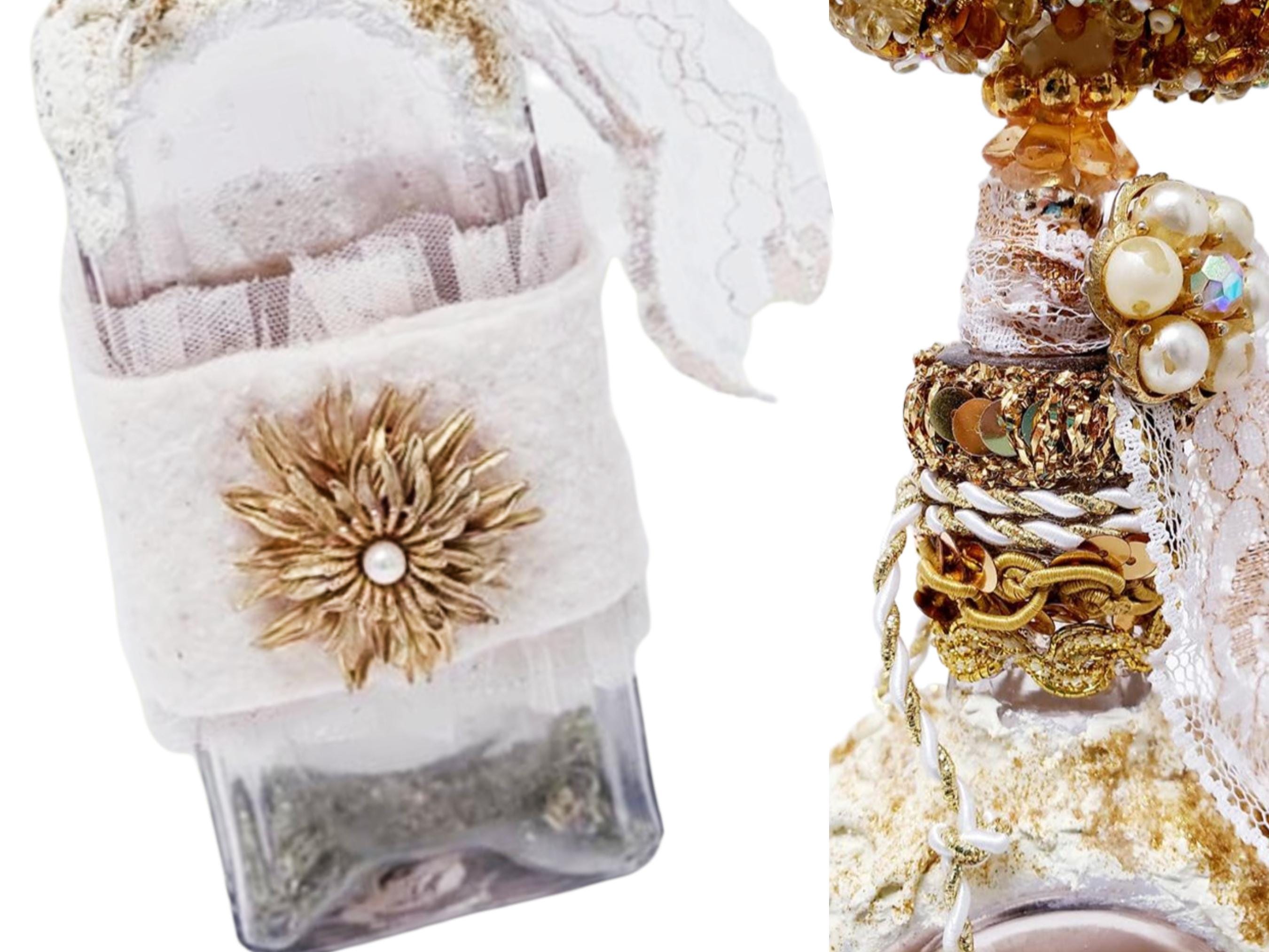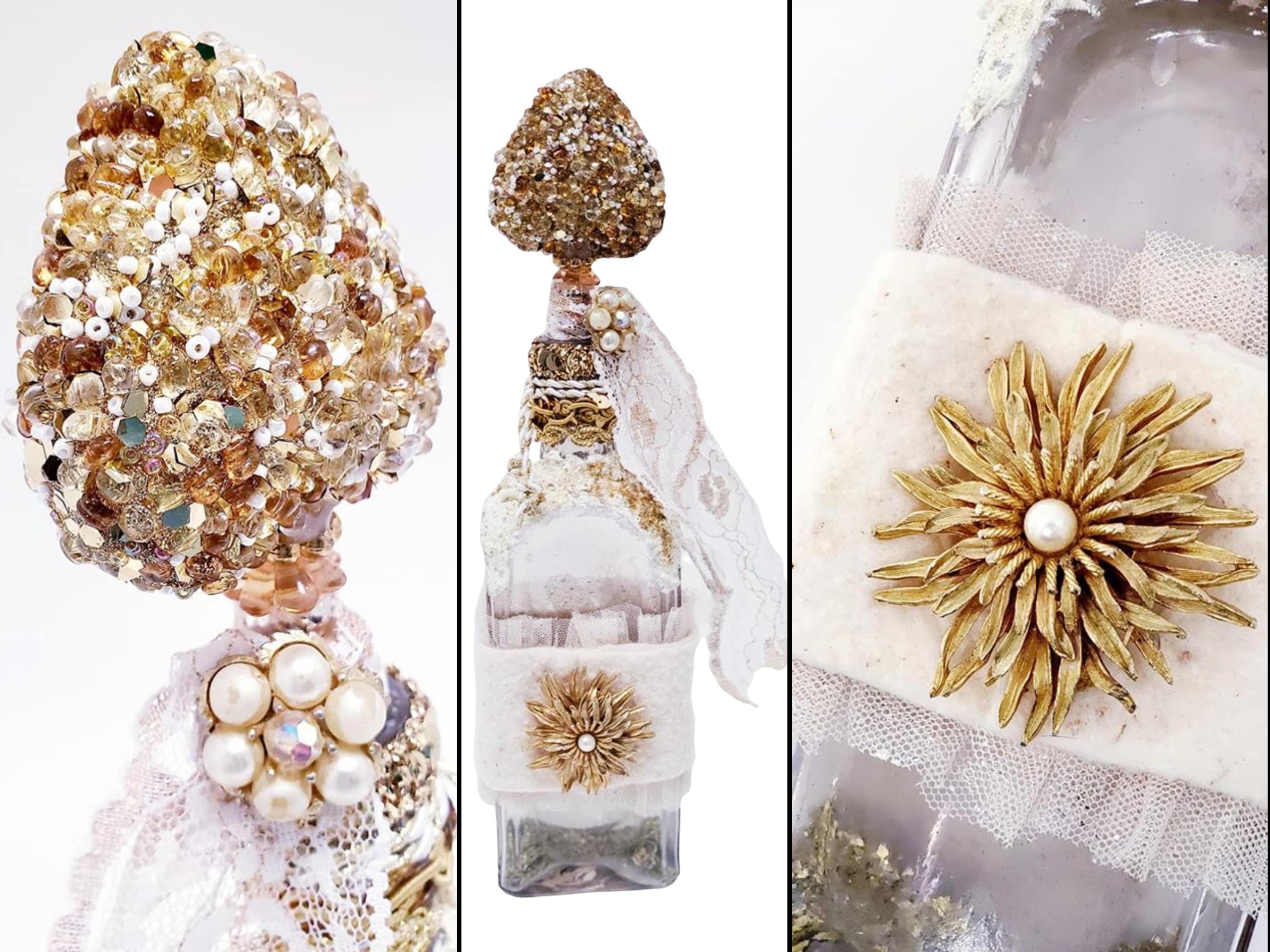 This altered bottle, tabletop center piece, is a marvelous re-use of an old gold vintage brooch, front center on the bottle. Notice another clever use of jewelry destach is the old vintage pearl clip-on ear bobble sitting to the side right of the topper. Speaking of the topper, it is actually a Christmas ornament turned upside down. All the sequin trims and lace came from years and years of my collecting and preserving embellishments from clothing gone by.