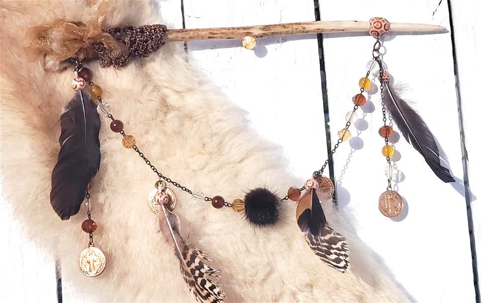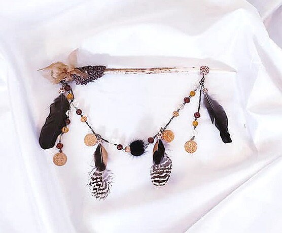 The stick is hand carved, straight, and coated with a hard car wax to aid for a smooth glided insertion. This also gives it a glossy sheen. Hand whittled with a pointed tip but definitely not to sharp. From left to right is a cascaded drapeage of feathers, beads, coins and brown acrylic clear faceted beads.