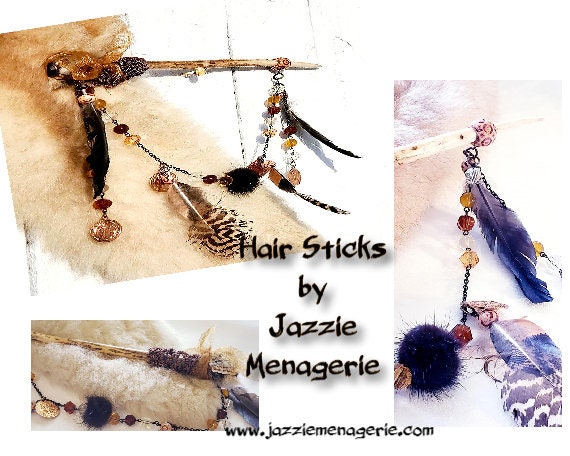 Seven shades of bronze and brown feathers, jewelry de stash of chains and charms. The tail of the hair pin is a wrapped around a swatch of crocheted trim and fur, organic, earthy and sophisticated.